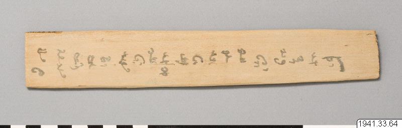 Handskrift på trästav. Texten är på språket Saka eller Sakiska (även khotanesiska eller khotansakiska) ett utdött östiranskt språk. Folkgruppen Saker, eller Skyter, var nomadiska och räknas som utdöda sedan 900-talet. Området skriften kommer från är idag Xinjiang, Kina. Skriften är en variant av typen brahmi (brahmiskrift) med viss modifikation, bl.a. tillagda tecken.