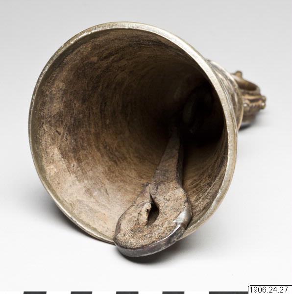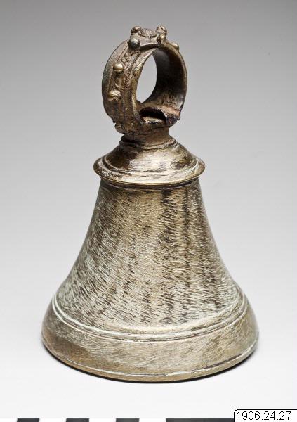 • Klocka, koskälla. Odekorerad klocka med ögla, dekorerad med knoppar. Krokformad kläpp.