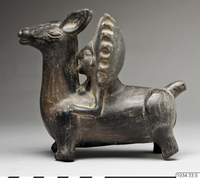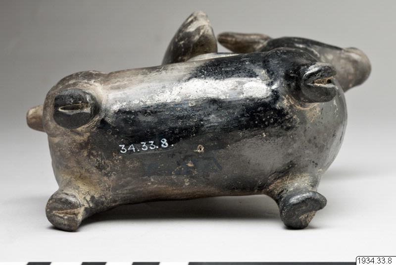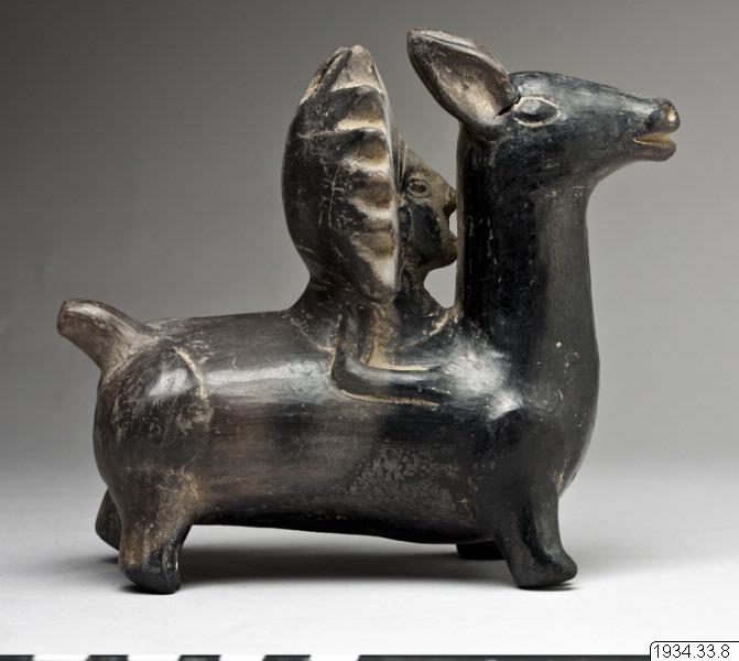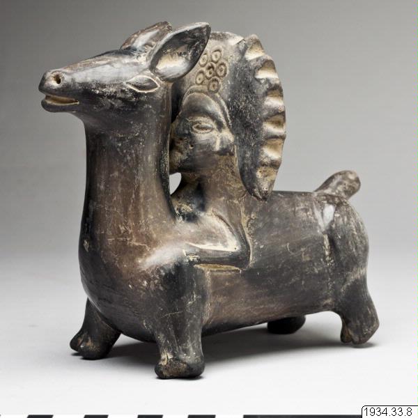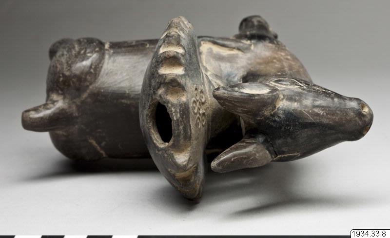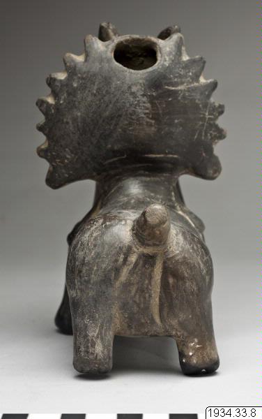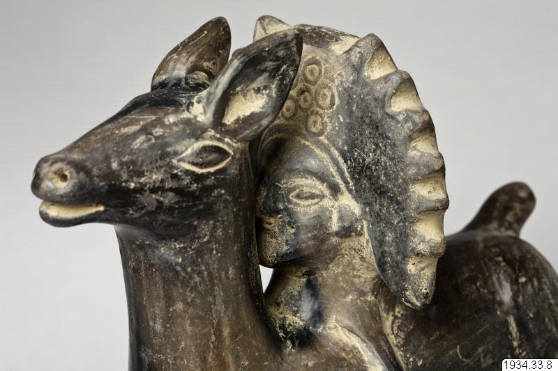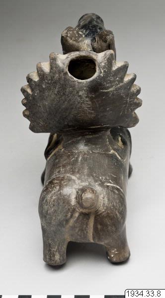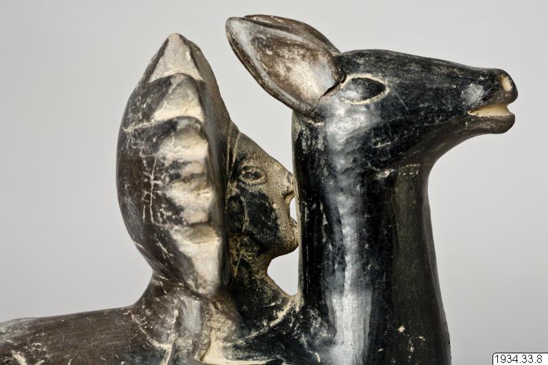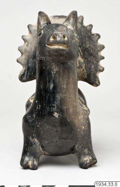 Lerkärl. Djurfigur, lamadjur eller dylikt med mycket korta ben och tjock, rakt uppstående hals. På figurens rygg ett människohuvud, fritt, vertikalt placerat samt armar i låg relief. Huvudet har stor bågformig, samt i kanten, tandad huvudprydnad.