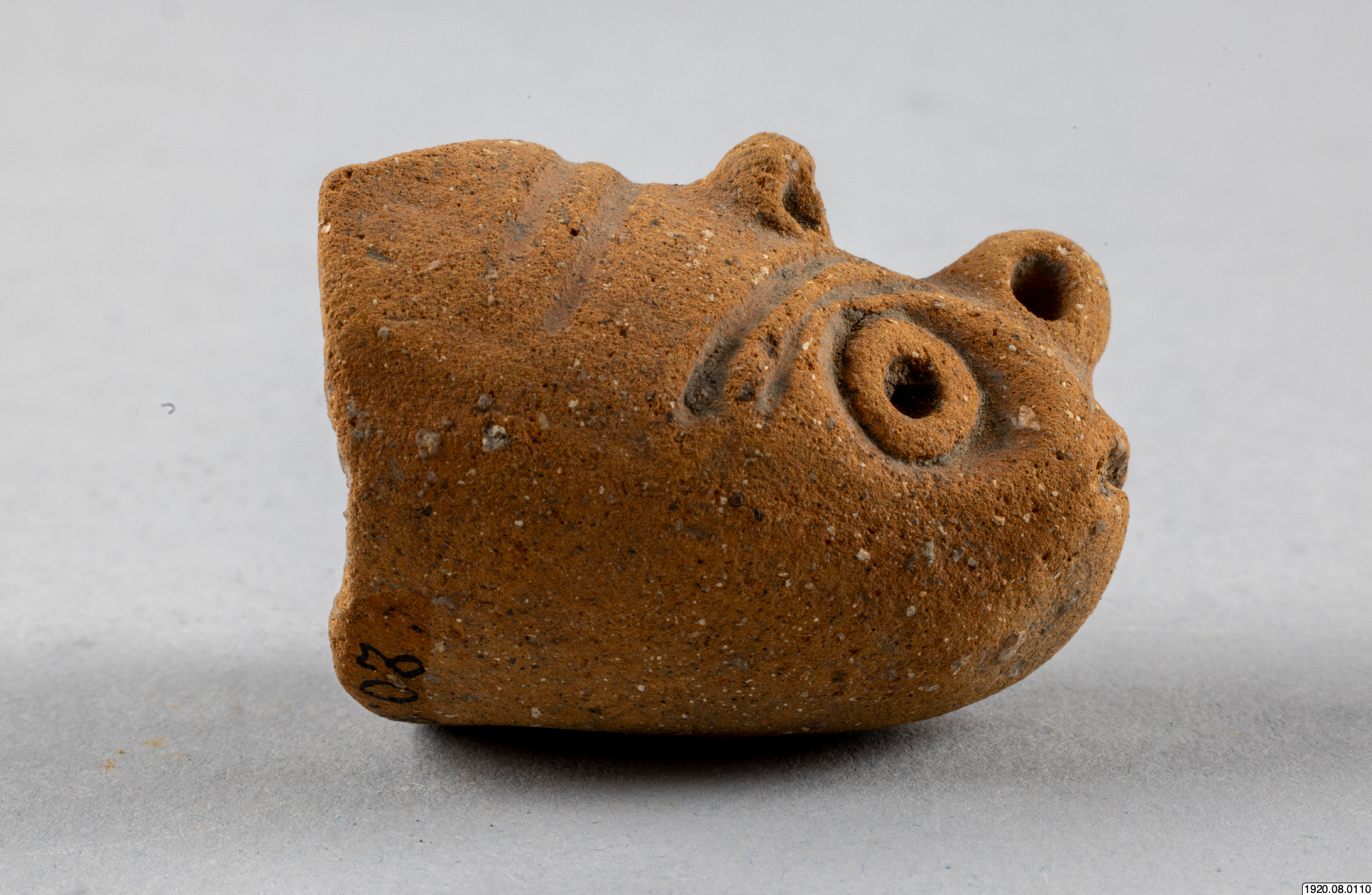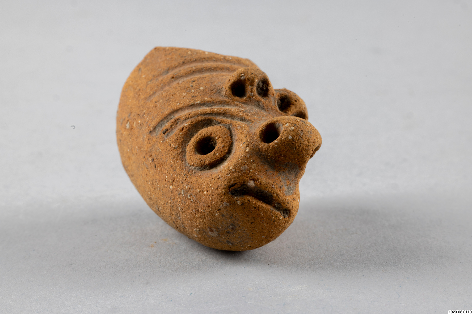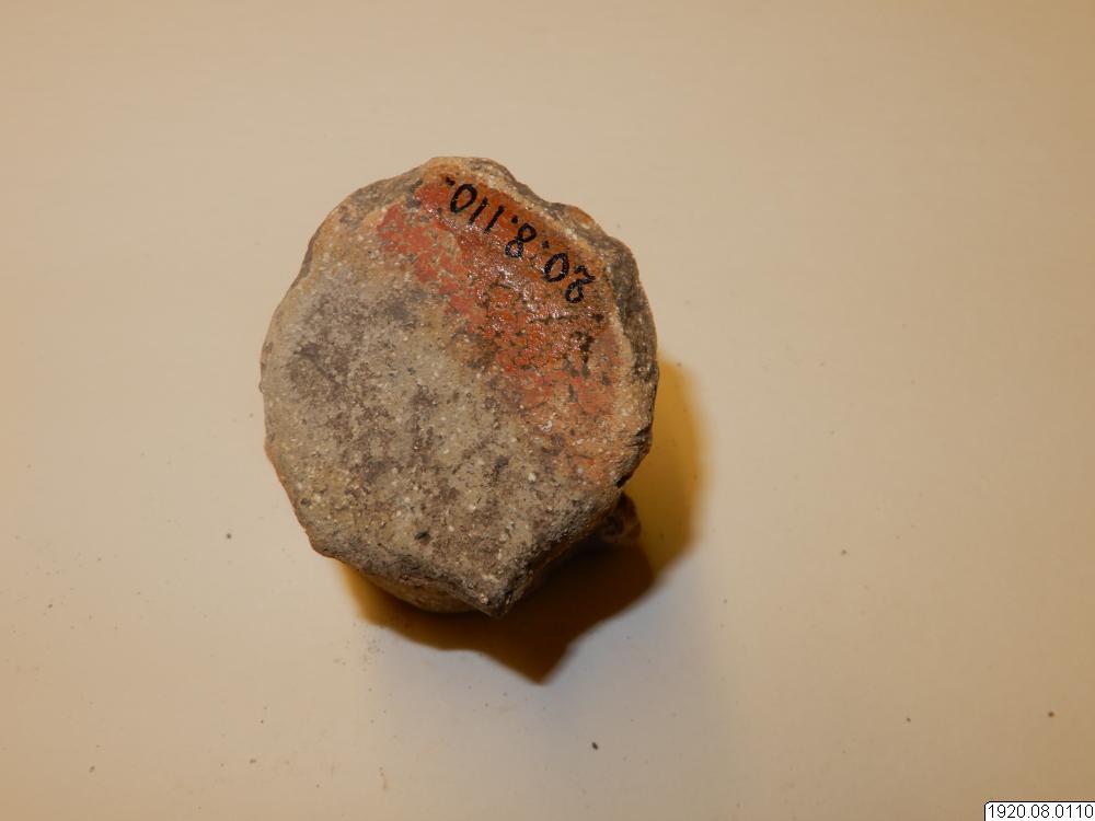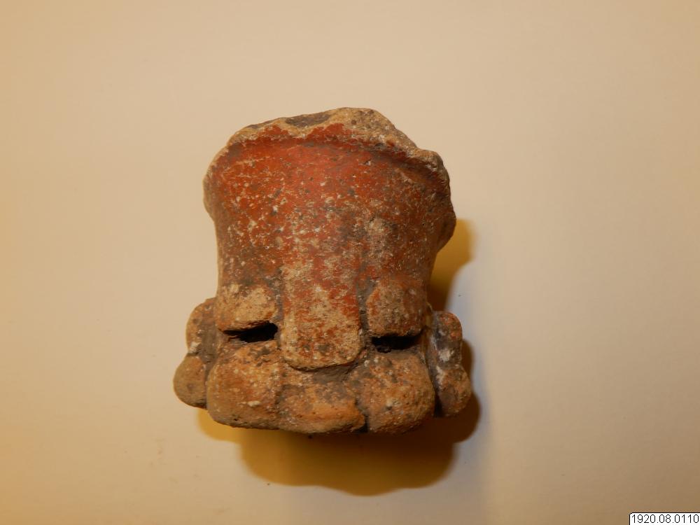 Kärlfot. Cylindrisk, rödmålad, färgen delvis borta. Står snett mot kärlytan. Platt nedtill. Människoansikte med ögonspringor som hål, bred näsa, mun och kinder i relief, öron med öronpluggar? Baktill ett hål. Fylld med smuts, så att man ej kan höra skallring. Typ jfr nr 100 (generalkatalogen)