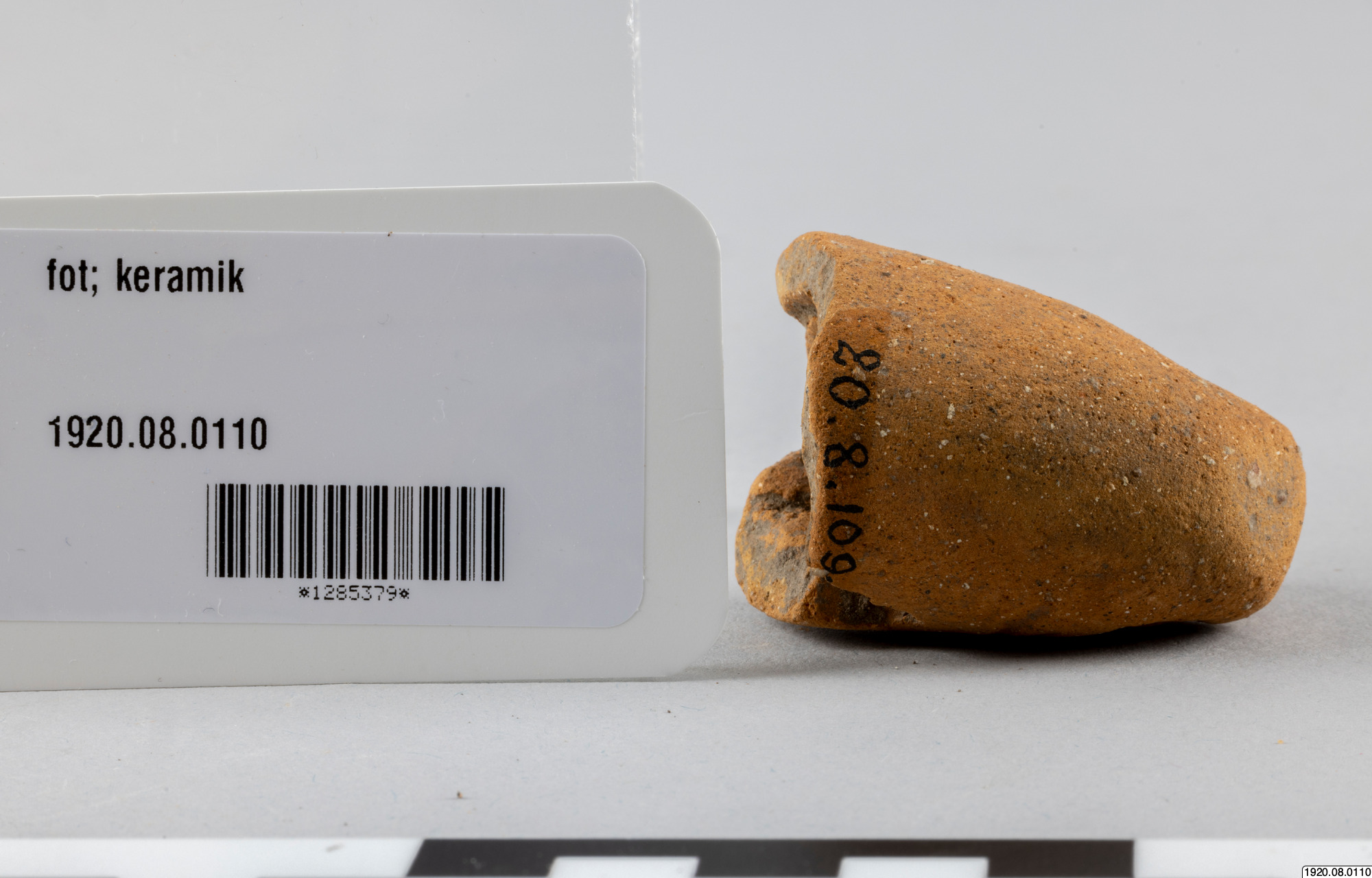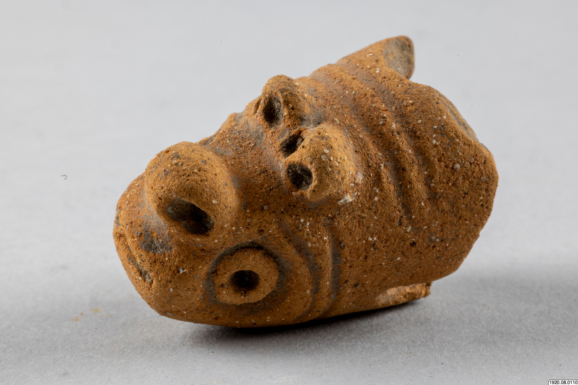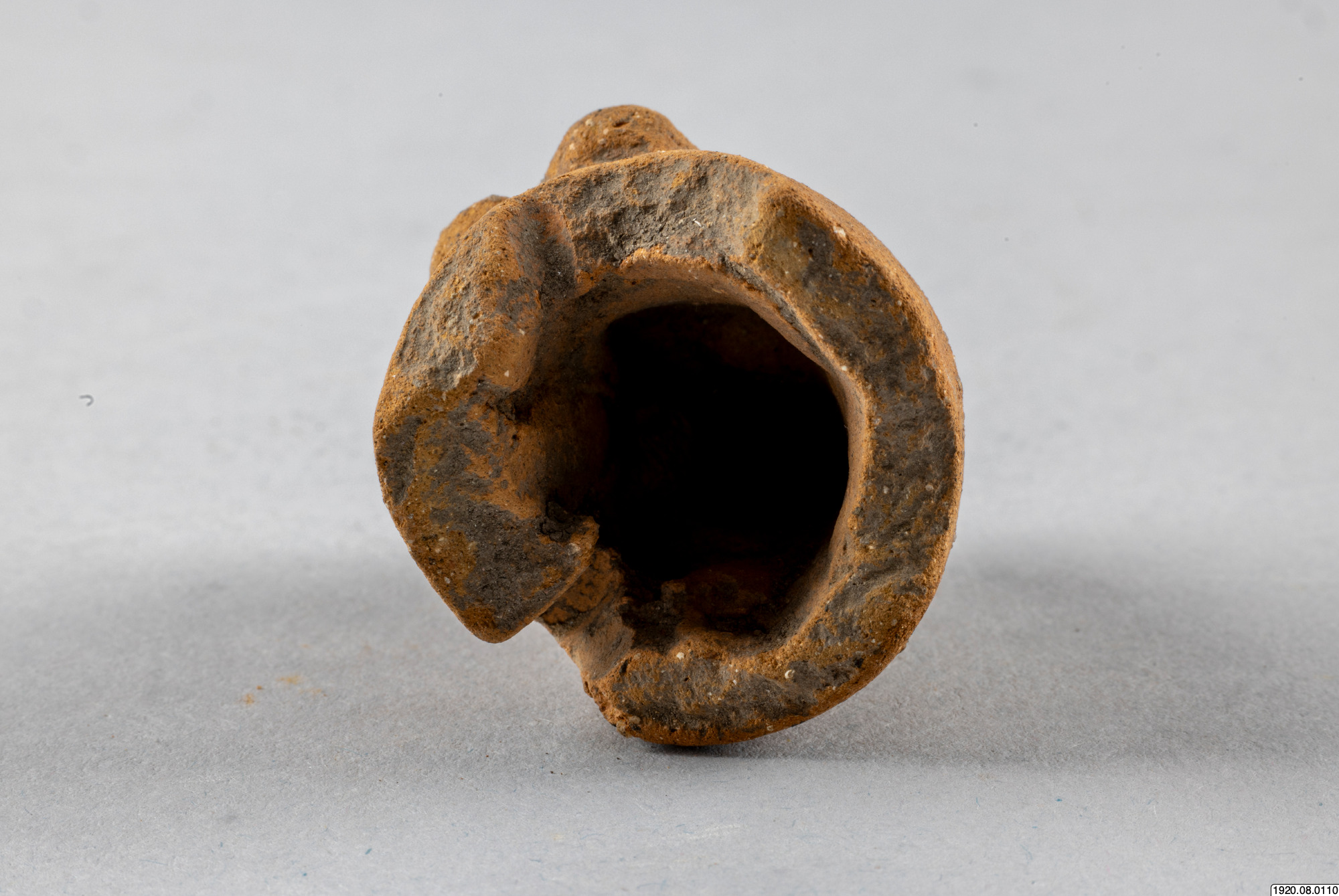 Kärlfot. Cylindrisk, rödmålad, färgen delvis borta. Står snett mot kärlytan. Platt nedtill. Människoansikte med ögonspringor som hål, bred näsa, mun och kinder i relief, öron med öronpluggar? Baktill ett hål. Fylld med smuts, så att man ej kan höra skallring. Typ jfr nr 100 (generalkatalogen)