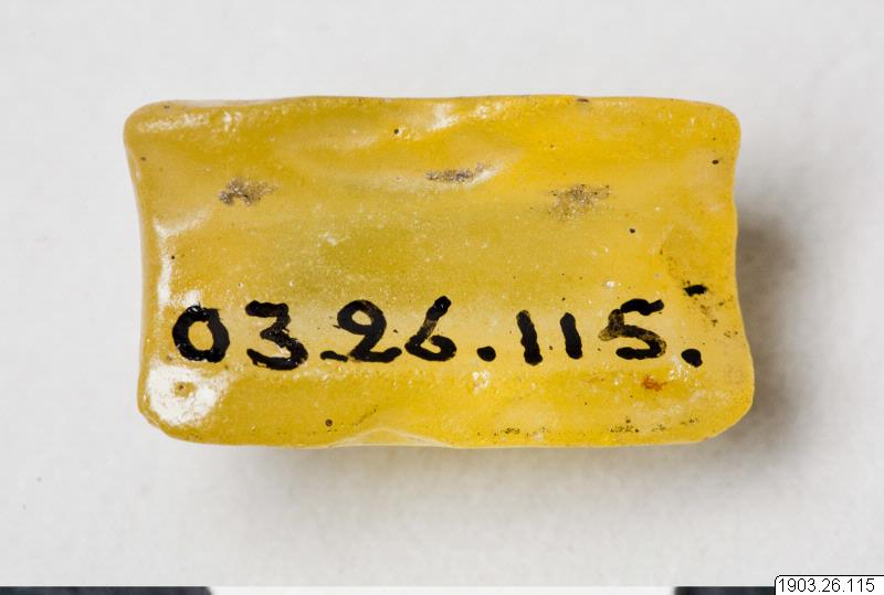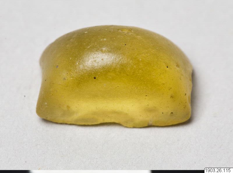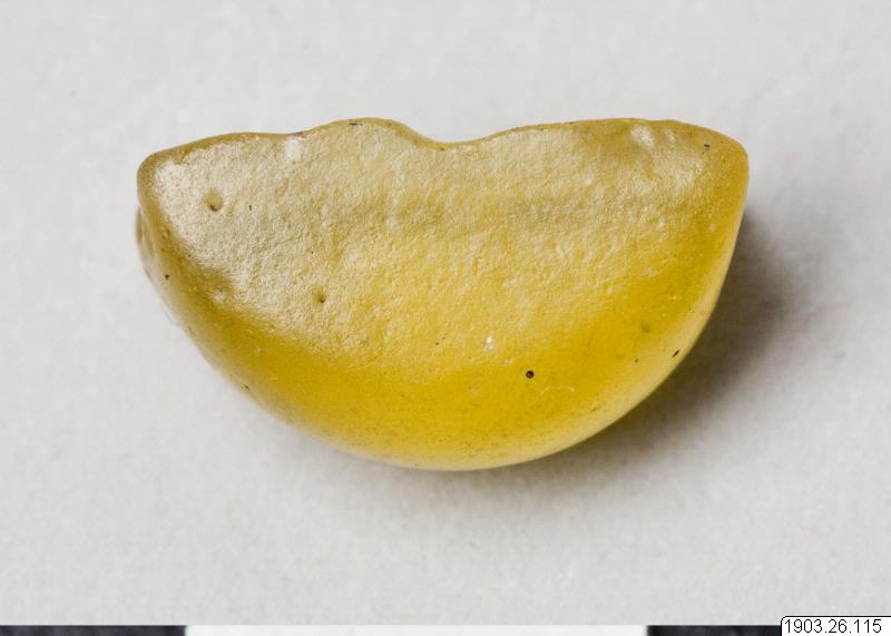 Bead-like object of yellow translucent glass being a semicircular dise, grooved along the straight side. Fototext