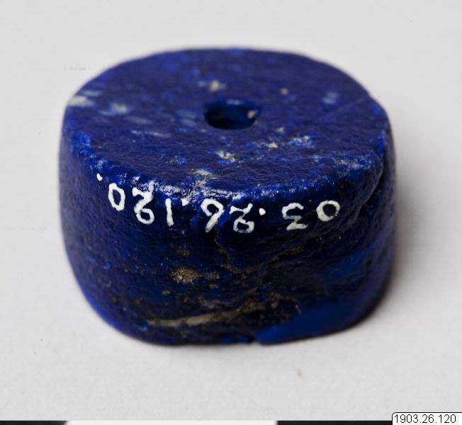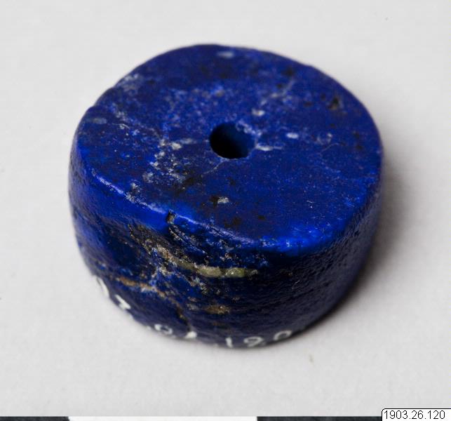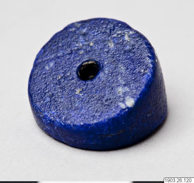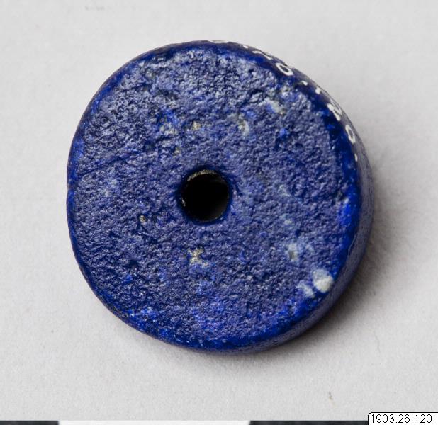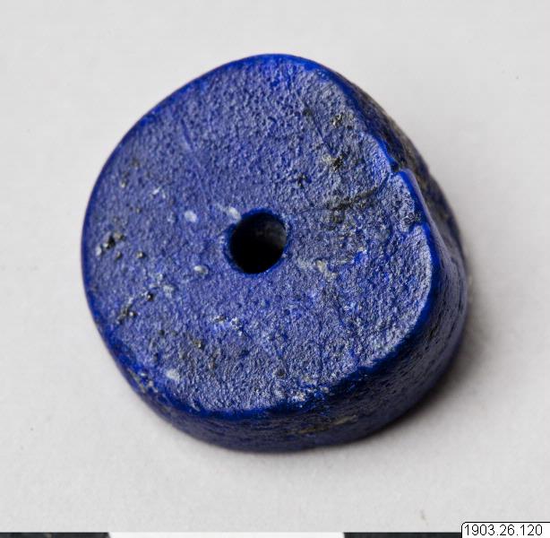 Discoid bead of lapsis lazuli, the edge on one side three times as thick as on the other. Fototext