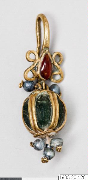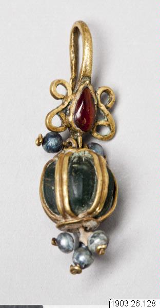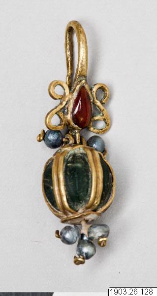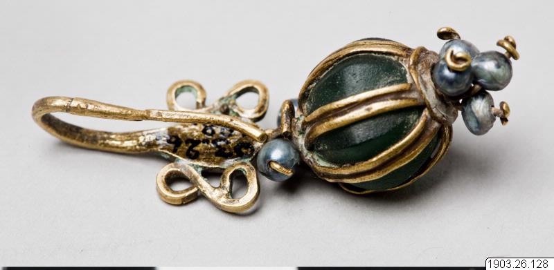 Ear-pendant. Upper part consists of a hook of gold wire (or gilt bronze?) at the flattened base of which is an inset drop-shape piece of carnelian: at each side of it an S-shaped wire. Below is a loop. Through this and the two loops on the lower part of the pendant is fastened a horizontal piece of wire with a pearl at each end. Lower part consists of a hexagonal bead of emerald-coloured glass in a frame of six flat gold ribs, running vertivally and each having one longitudinal groove. At the lower end of a bunch of four small pearls fastened on a wire running through the whole of the bead. Fototext