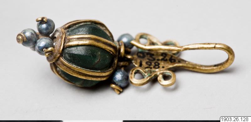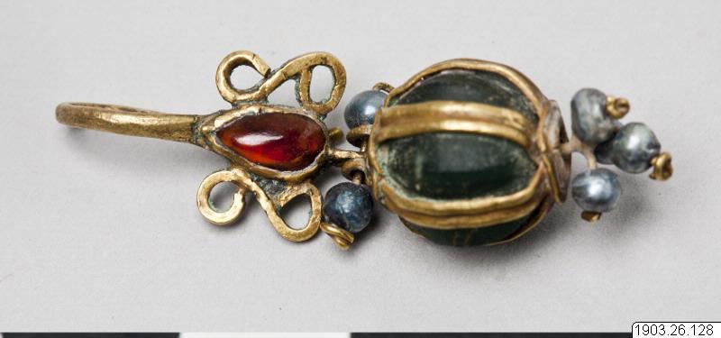 Örhänge. Den översta delen består av en krok av guldtråd (eller förgyllt brons?). Vid den platta basen finns en infälld droppformad bit av karnell, omsluten av s-formad guldtråd. Nedan är en slinga. Genom denna och de två slingorna på den nedre delen av hänget löper en horisontell tråd med en pärla fäst i vardera ände. Den nedre delen består av en sexkantig pärla av smaragdfärgat glas i en ram av sex platta guldribbor, som löper vertikalt och var och en har ett längsgående spår. I nedre änden sitter fyra små pärlor fastspända med en tråd som löper genom hela pärlan.