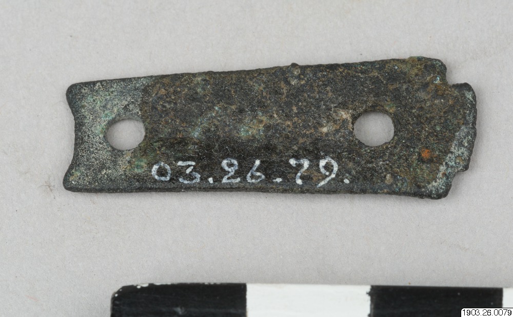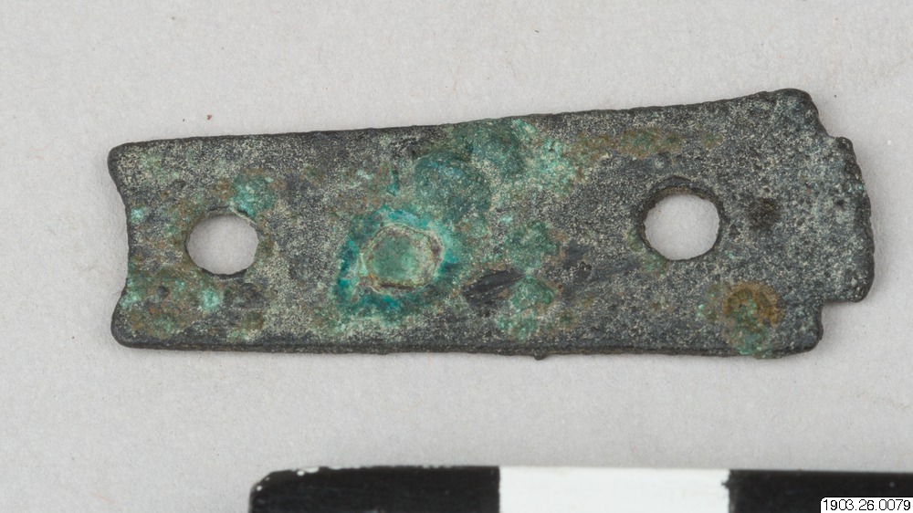 • Liten platta i brons med två hål för nitar.