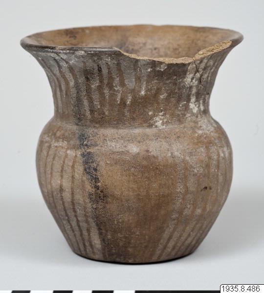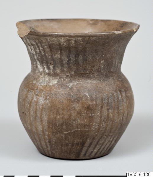 Lerkärl. Plan botten, rundad kropp och hög kraftig hals med utsvängd mynning. Kropp och hals dekorerade med inskurna vertikala grunda men breda linjer. Mellan linjerna, som bildar fyra grupper, har krukan sin ursprungliga glatta yta. (generalkatalogen)