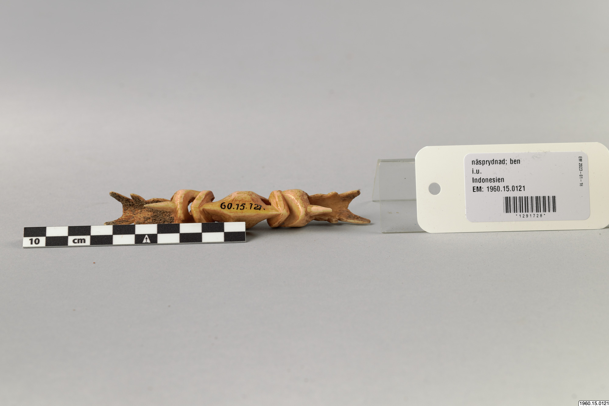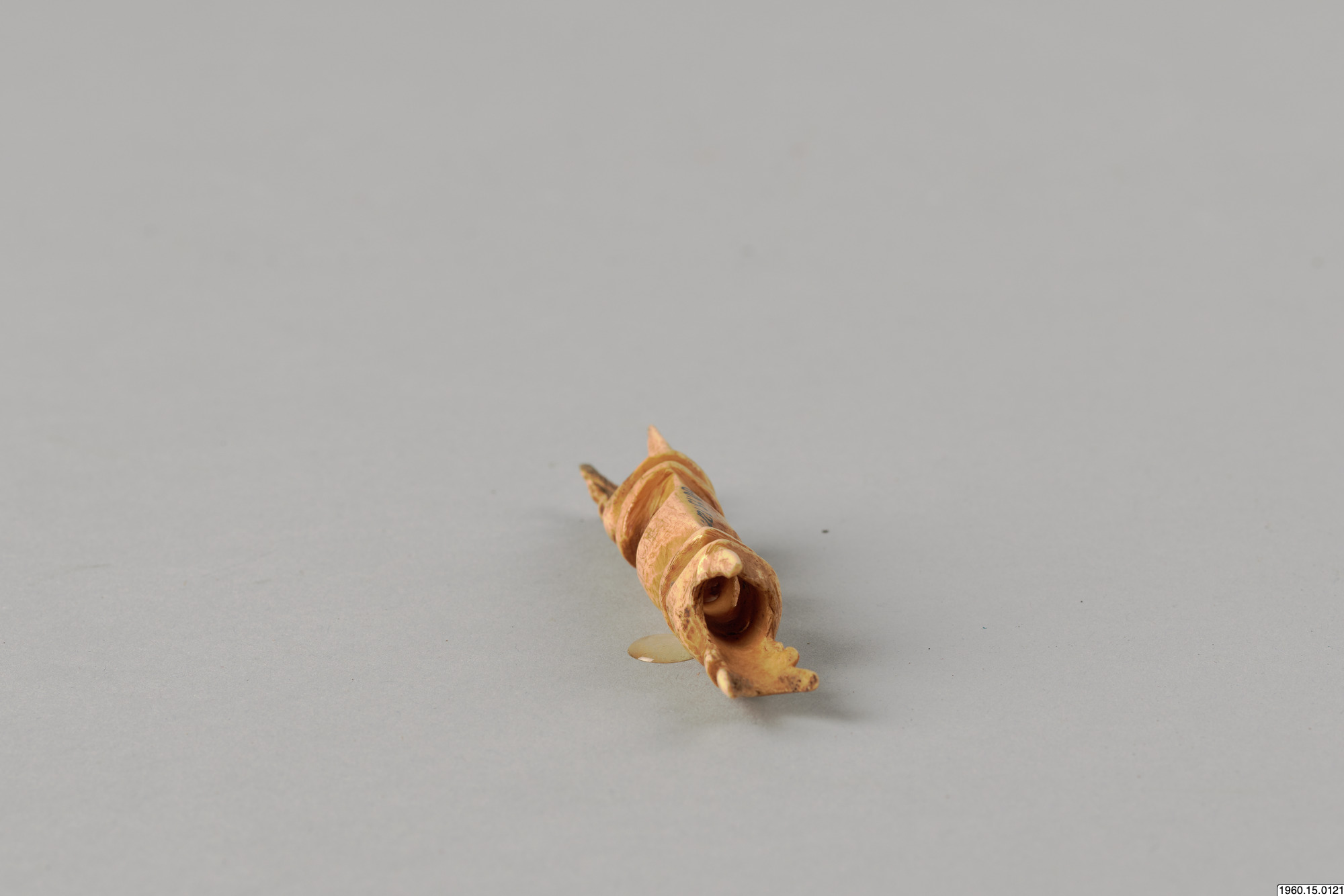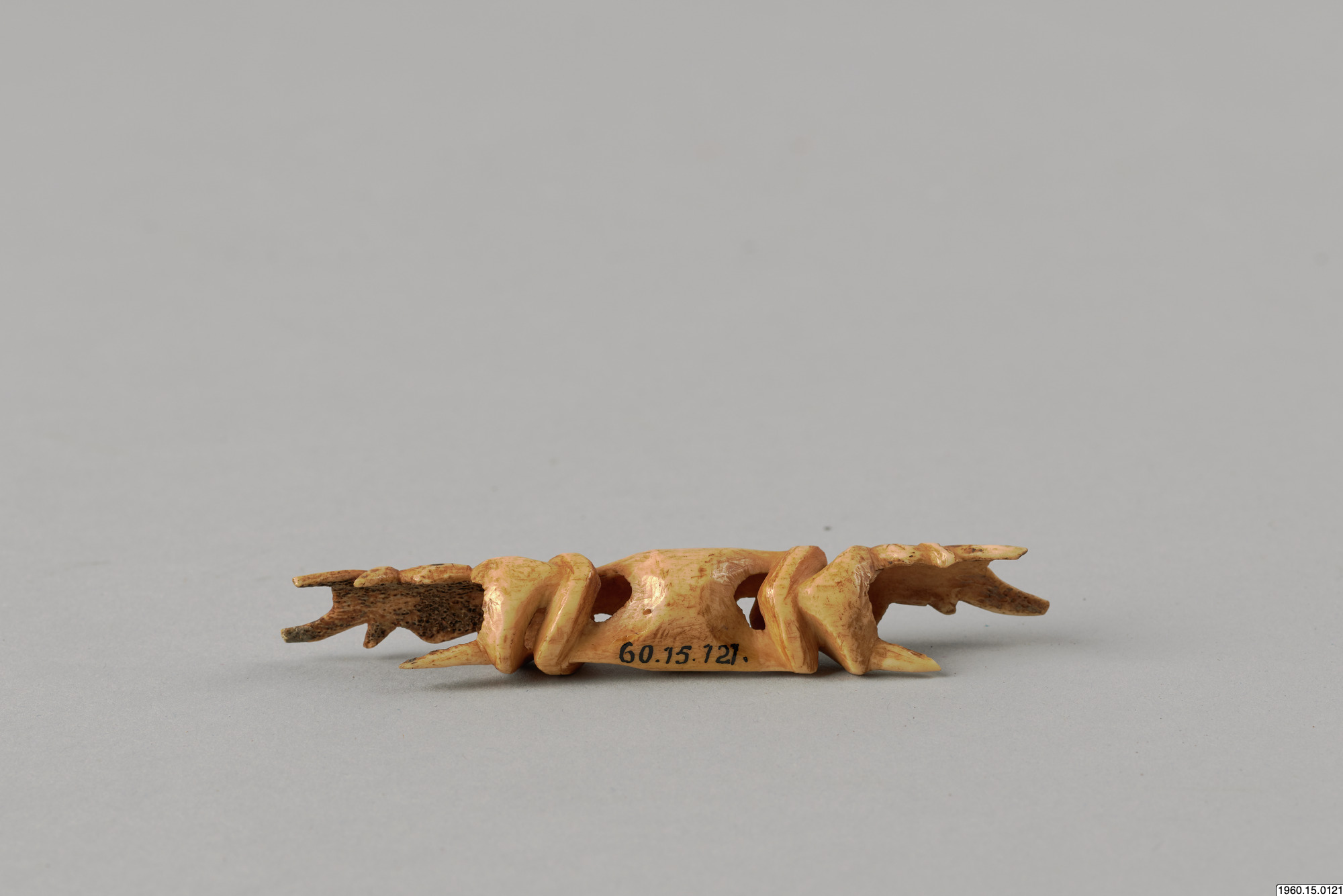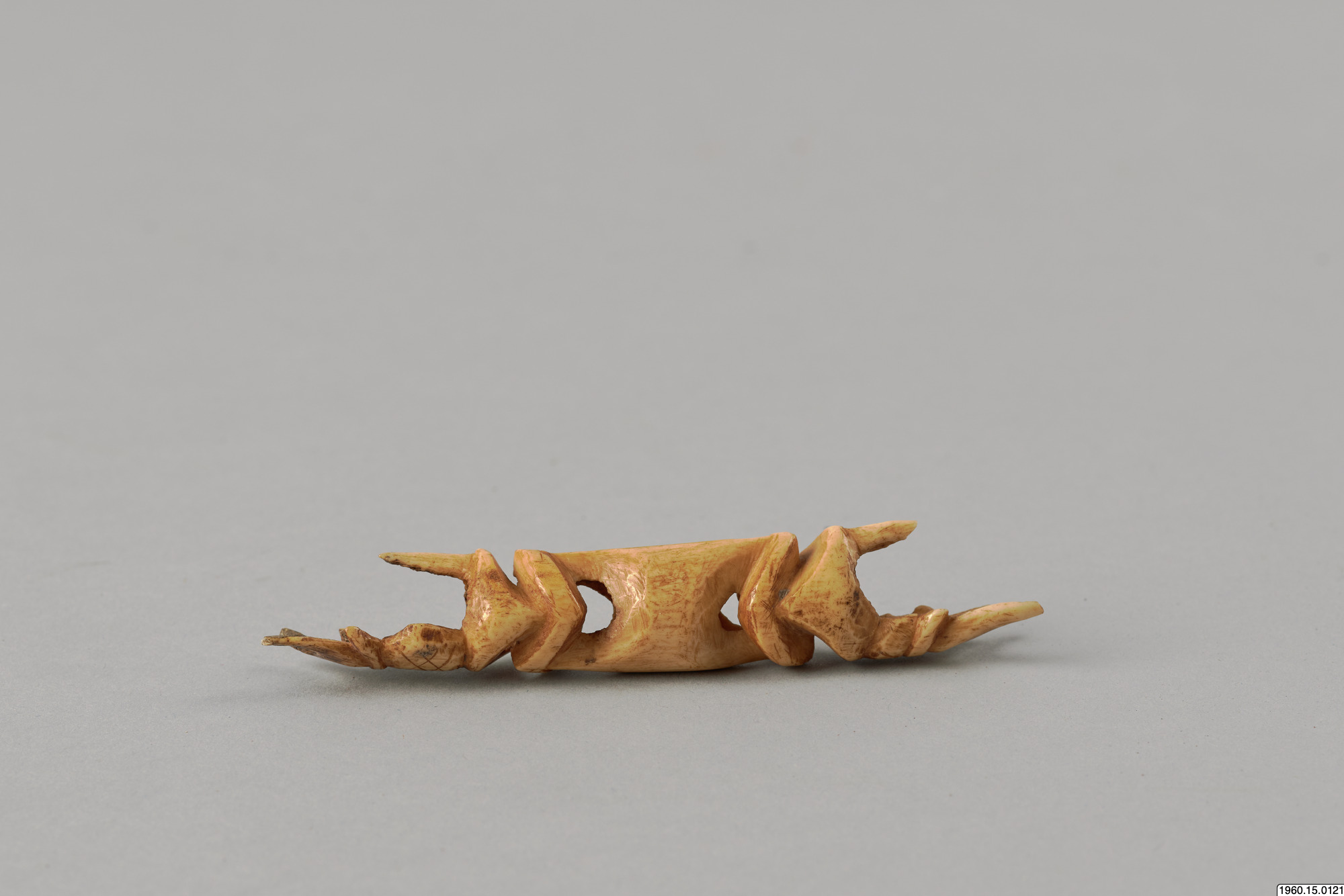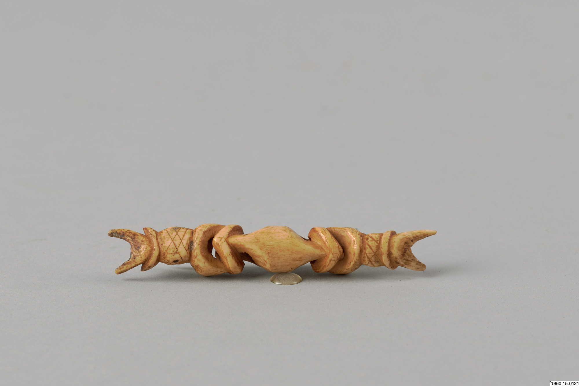 Stiliserad insekt. På översidan två sköldformade utskärningar. Två plattor med inristade krysslinjer, två bågar och ytterst på var sida u-formade utskott. Längd: 12,3 cm, Diameter: 6,1 cm. Generalkatalogen.