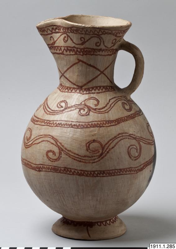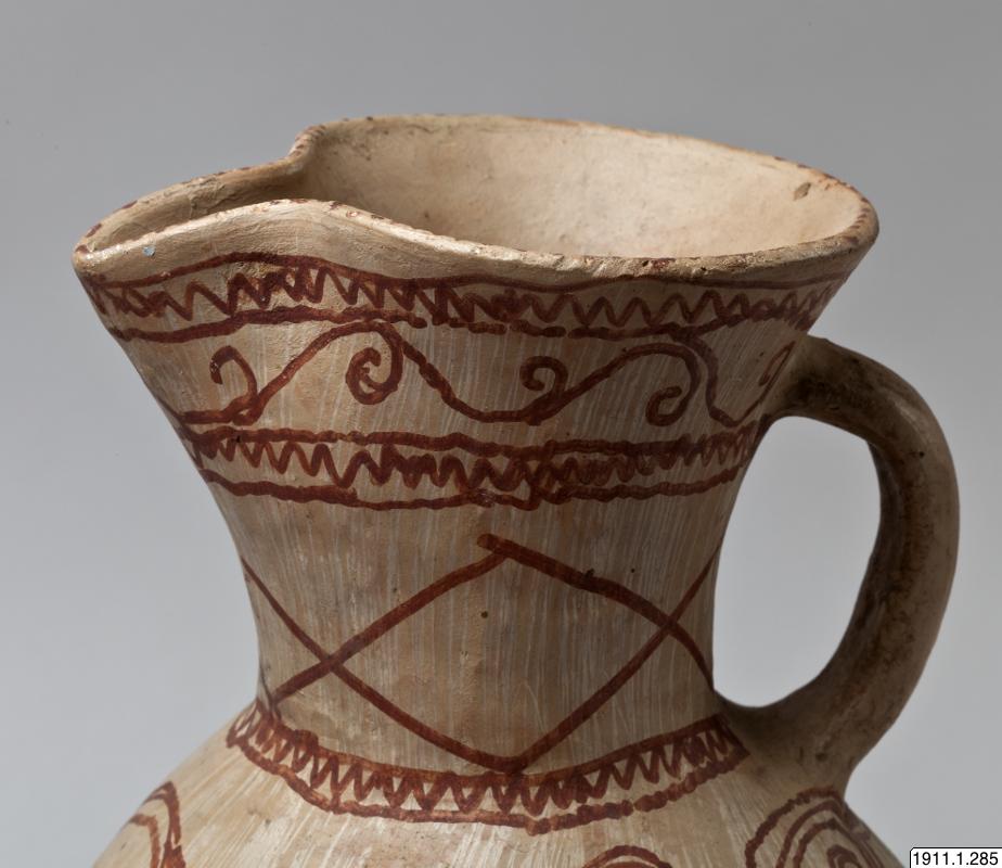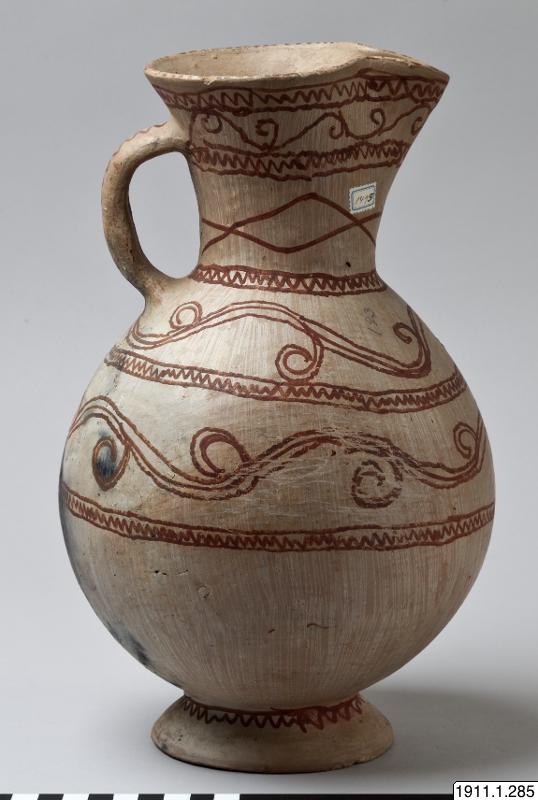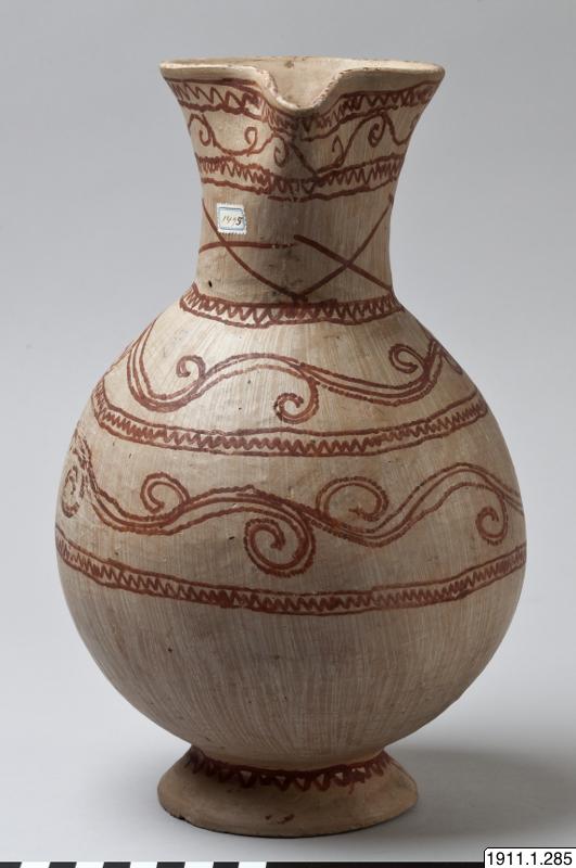 Kärl. Stort lerkärl av bränd, oglaserad lera, målad med band i rödbrunt, föreställande omväxlande sig-sag-band och löpande spiraler. Kärlet är i form av högt krus med hög utviken fotdel, stor rundad corpusdel samt relativt hög halsdel, vilken senare på ena sidan är försedd med öra, på andra med en utviken mynningsdel. "K'ilb". 1495. [ocr]