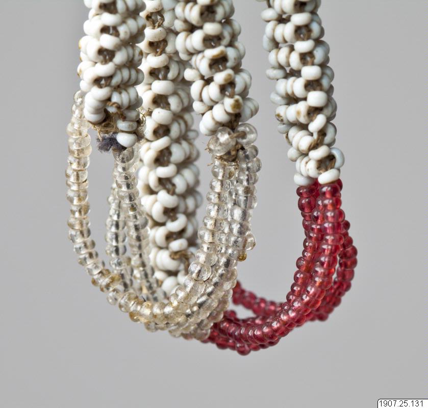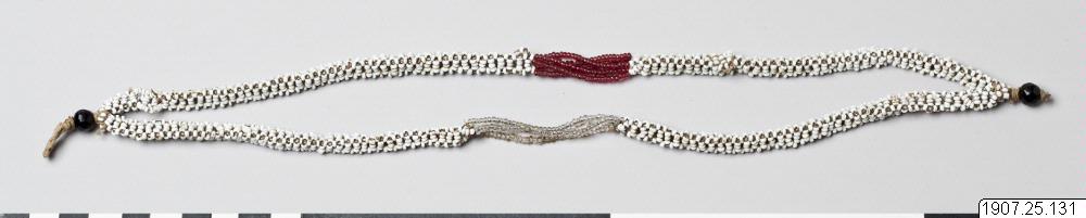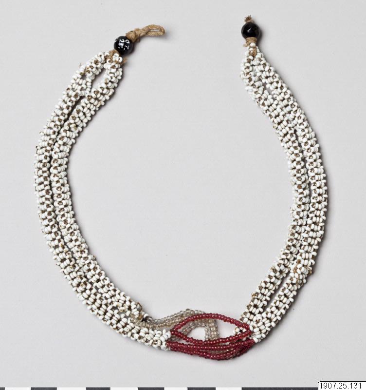 • Halsband med röda och vita glaspärlor. Bärs av barn.