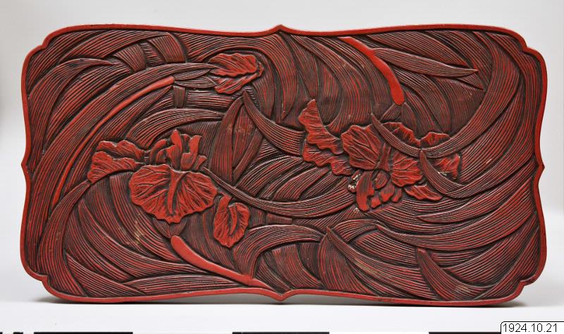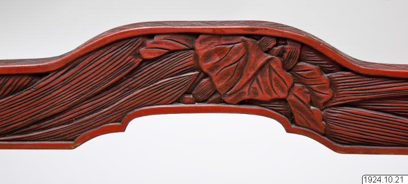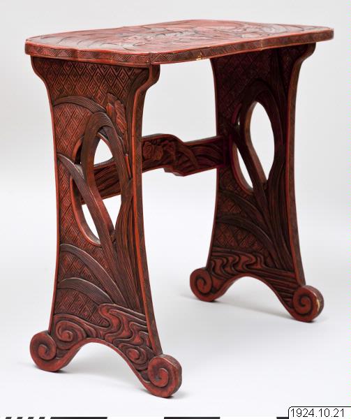• Tebord, pallformig. Lackerad i rött, skulpterad med vegetativa motiv. På bordskivans översida liljemotiv (yuri). Liljemotiv ej särskilt uppskattat av japanerna, mera av européerna. Baksidan av bordskivan svartlackerad. De två flata, genombrutna, med en tvärslå förenade benen har även de liljemotiv. De slutar nederst i voluter.
