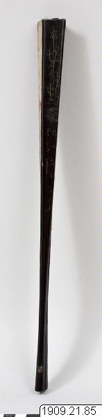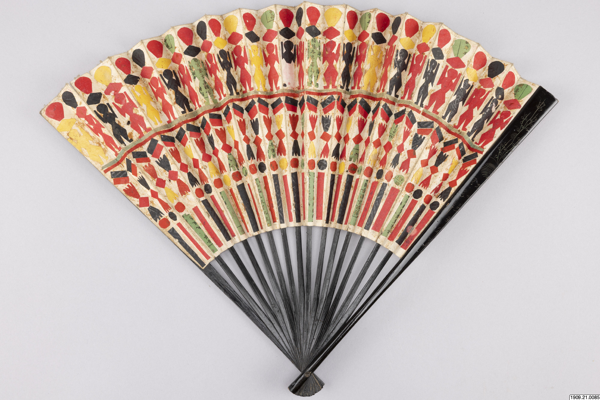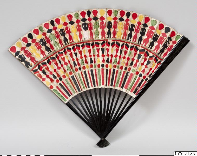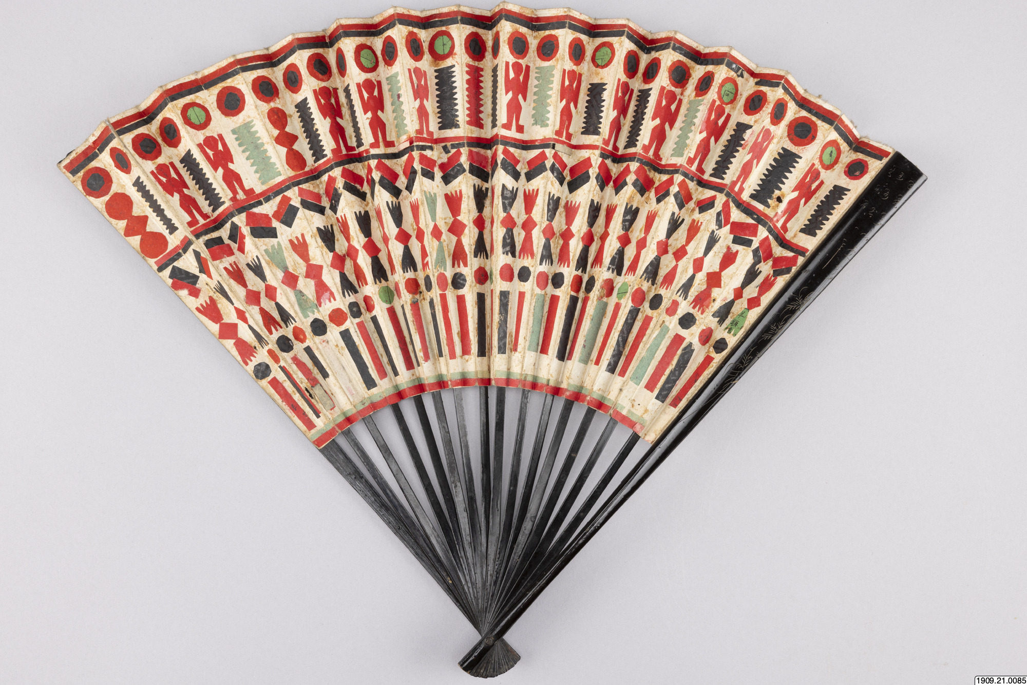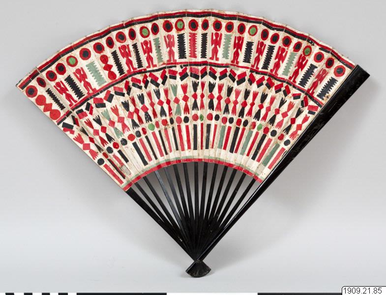 • Solfjäder av bambuspröt med påklistrat vitt papper. De färgrika, människoliknande figurerna är av papper och påklistrade. Chakobokoboji. Sutsopaizau. Paiwaugruppen. (generalkatalogen)
