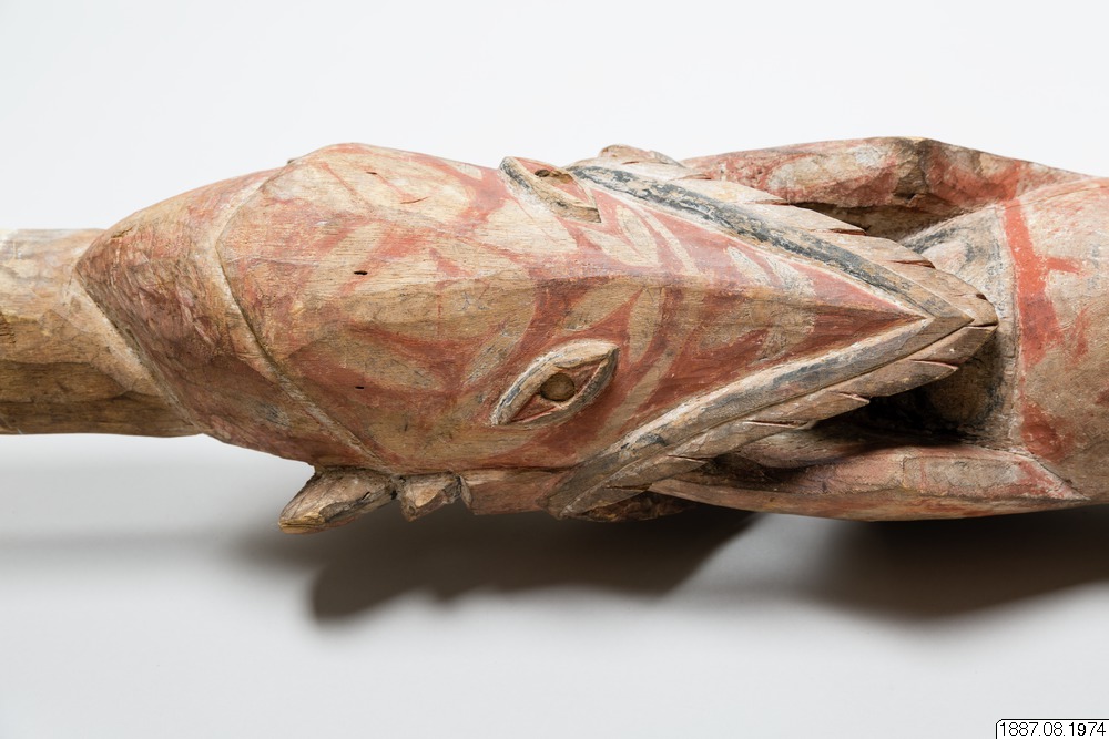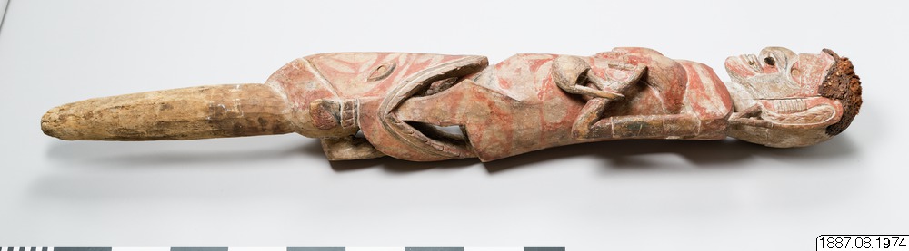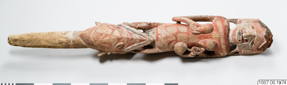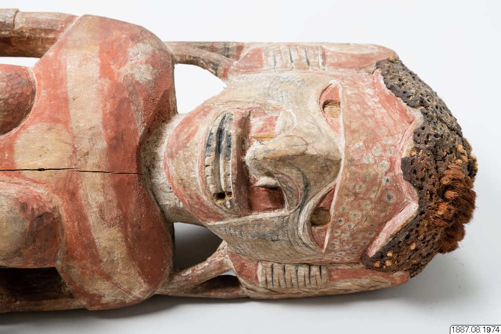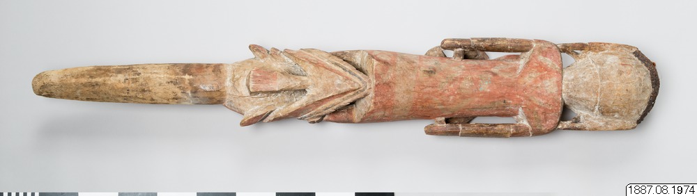 Träbeläte, gudinna, som i krig anropar om osårbarhet (enligt generalkatalogen). Snidad, målad träfigur föreställandes en kvinnlig förfädersande. Kvinnofiguren står i gapet på en fisk och håller om sitt ena bröst. Malangan-ceremoni för de döda samt initiering. Symboliskt motiv. (enligt Regius, Hélena).