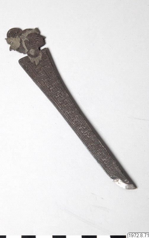 • Kniv av järn i form av en wayang-figur vars huvud och torso bildar skaftet. Eggen utgörs av ett litet avfasat stycke, på bägge sidor av spetsen. Figuren framställer möjligen Drupada, kung av Cempalareja. Figuren bär diadem, hårprydnad i form av en Garuda-fågel, örhänge samt halsband av en vitaktig metall, troligen silver, vari mönsterdetaljerna inristats. Den långsträckta torson har formen av en n... Visa hela