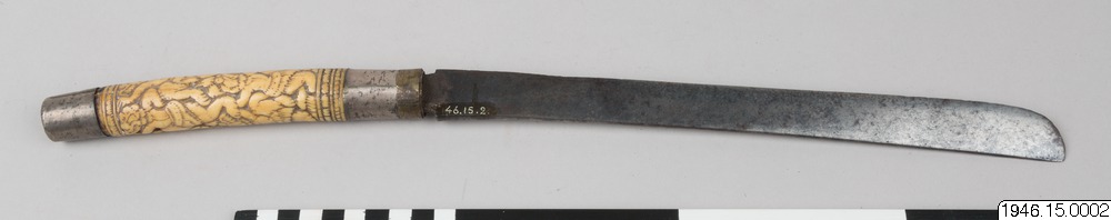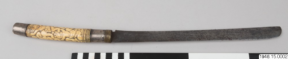 Svärd. Klingan är nästan rak och jämnbred. Fästet är av vitt ben med snidade demonfigurer. Släta silverbeslag vid fästets övre och nedre delar. Svärdets totallängd 46.5 cm. Siam Kniv. Bladet brett och kraftigt och avslutas i en skarp spets. Fästet är gulaktigt ben med snidade figurer: en sittande gudagestalt med toppformig huvudprydnad uppburen av två halvgudar. Knivens totallängd: 29 cm. Siam [ocr]Stäng
