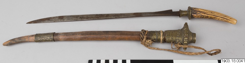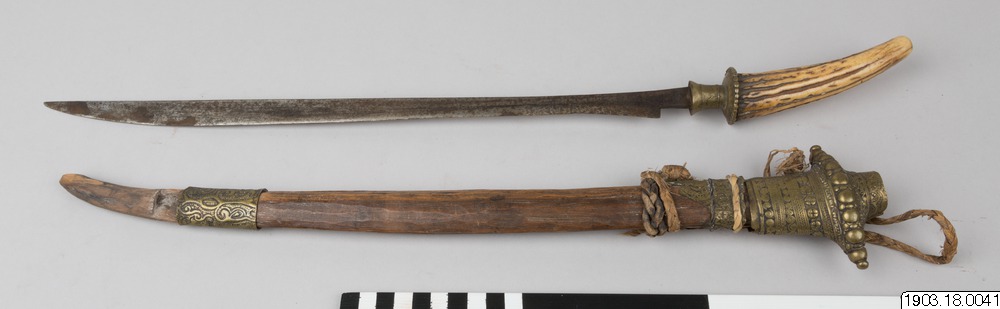 • A sword of the Toba Batak from Sumatra with an antler hilt and characteristic decorated brass fittings/details (spiral motifs) on its sheath.
