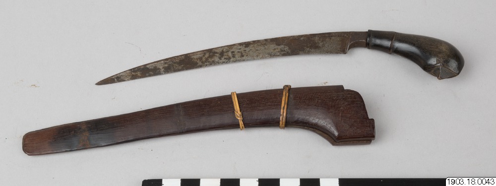 • A Sumatran thrusting knife with a horn hilt in the shape of a bird.