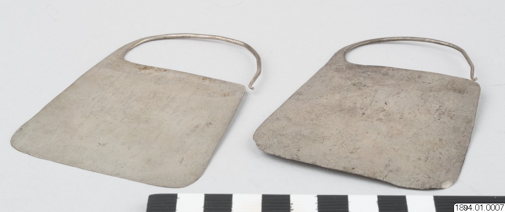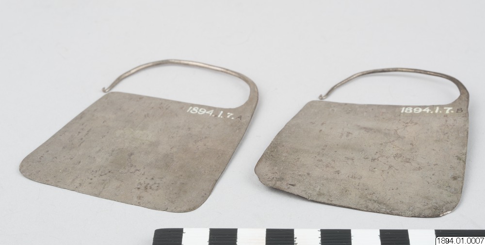 • Ett par stora araukanska örhängen av silver. Fru Eastman Valparaiso 24 mars 1884. Södra Chile Araukaner (generalkatalogen)