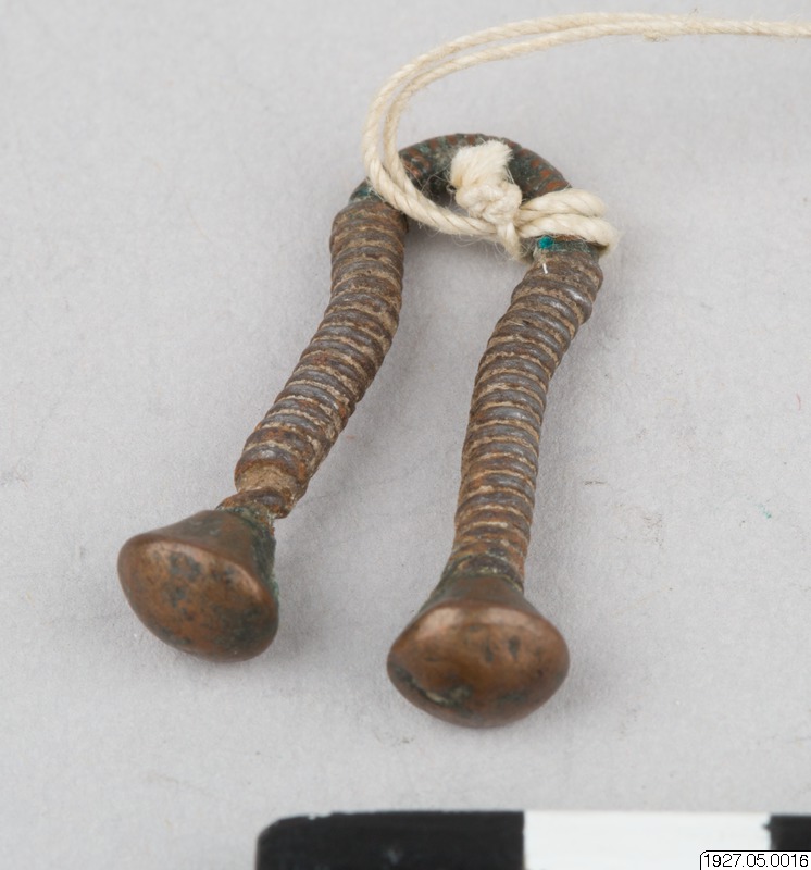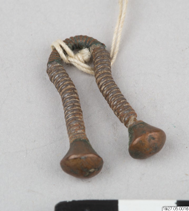 Örhänge av en typ, som även förekommer söderut, hos skikuyu, masejerna, och mera sällan skamba. Varifrån detta smycke antagligen kommit till turkans. De båda örhängen (15 och 16) bestå av en metalltrå...