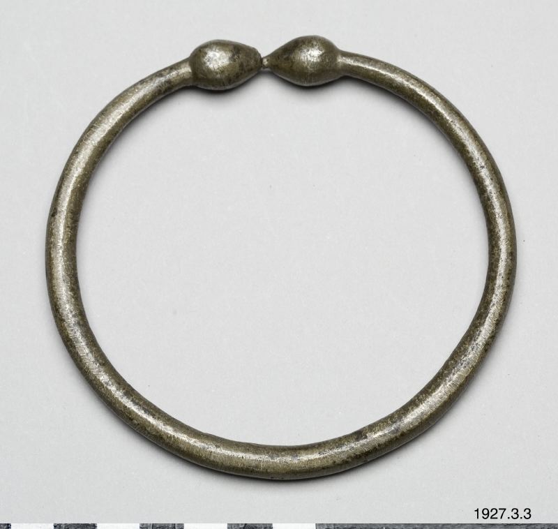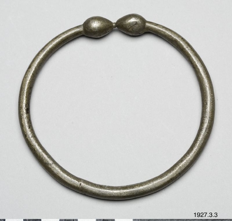 Fotring. Troligen för kvinna. Av ljus metall (legering?), slät, slutändar med koniska knappar (fig.). Köpt i Kapstaden, enligt uppgift från Kaffrer. Diam. 11 cm. Kaffrer Kapstaden Sydafrika