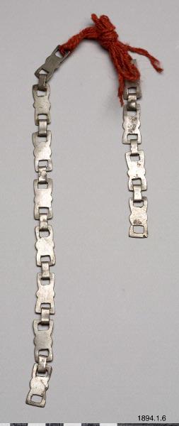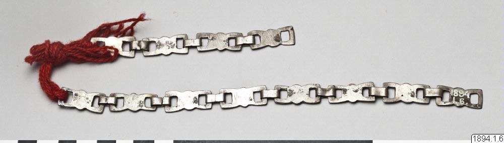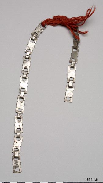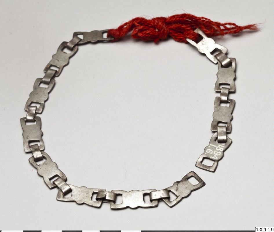 Araukansk halsband av silver, bestående av tolv stora länkar och 11 små (en fattas). Herr Evans Valparaiso 24 mars 184. Södra Chile Araukaner (generalkatalogen)