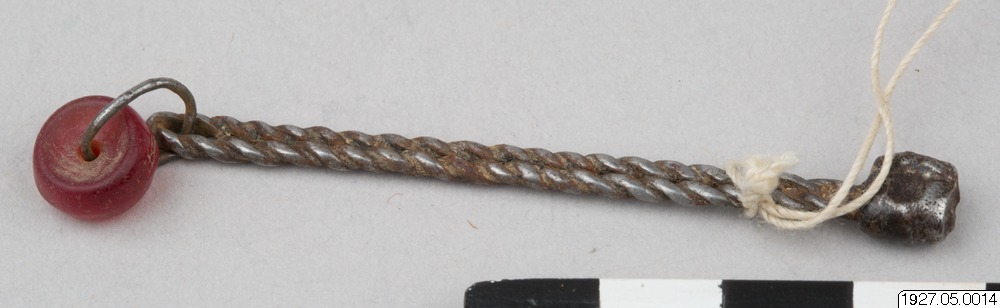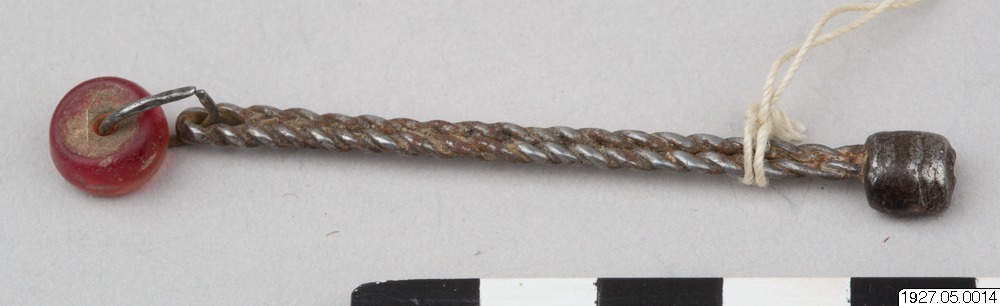 (se fig.) av tvinnad järntråd, i övre ändan omsluten av en järnremsa, bildande knappen. Nedtill, i en liten järntrådsring, en röd glaspärla. Längd: 7.5 cm. Bäres åv fattiga män. [ocr]