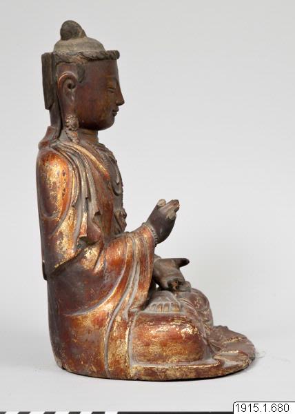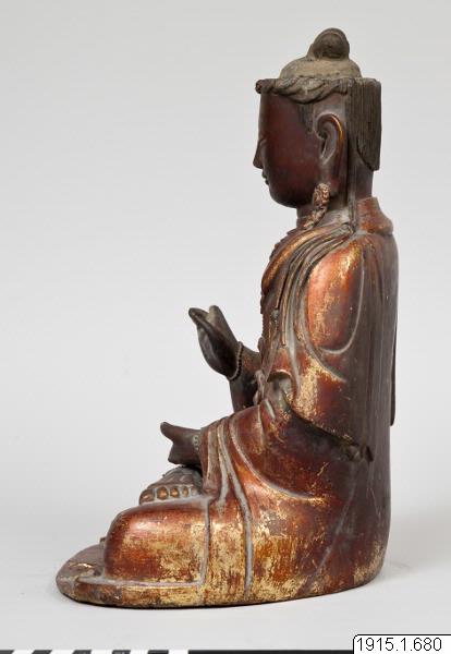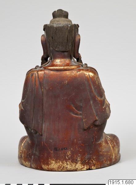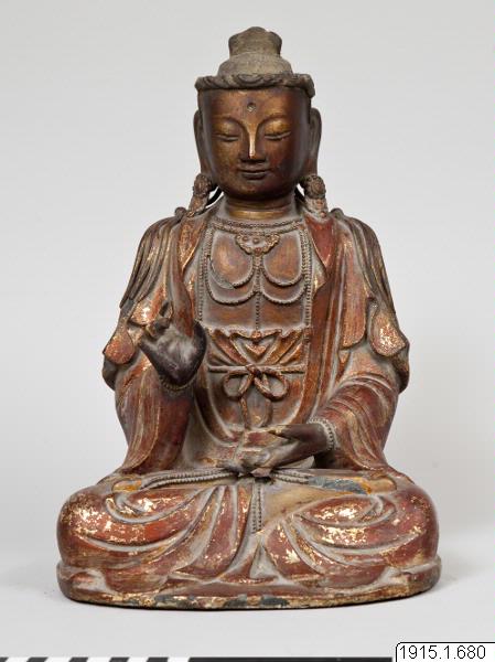 Buddabild, skulpterad i trä och förgylld. Sittande med korslagda ben. Högra handen upplyft (fingrar avbrutna). På undersidan ihålig för instoppande av bönerullar. Från lamatemplet i Tibet. Fint fynd från Ming-tiden. I pannan ett hål (generalkatalogen)