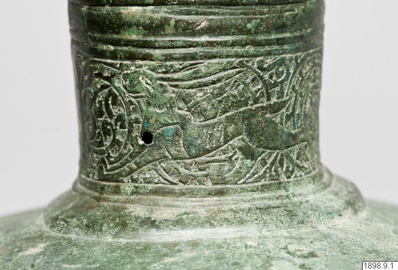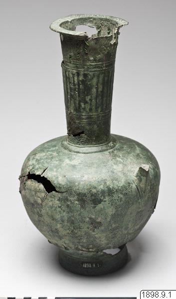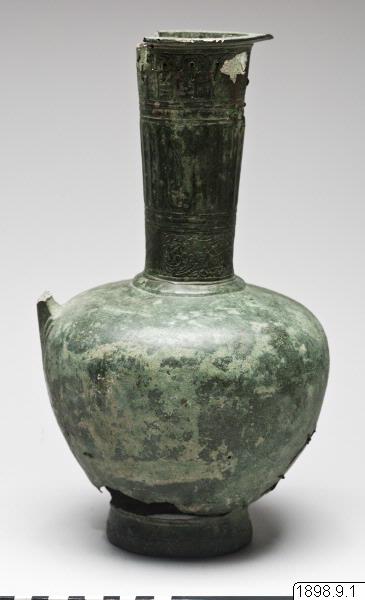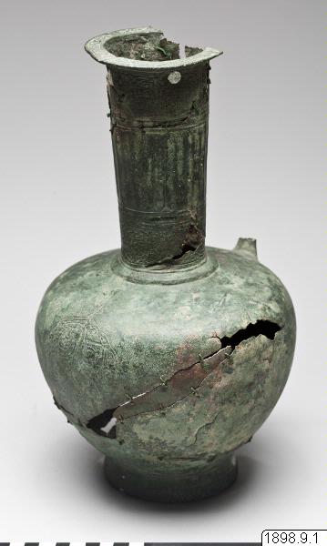 Kanna, skadad. Lagad med koppartråd. Fragment, däribland bottnen, saknas. Hög fotring, kannan bredast över skuldran. Hög hals med utvikt mynningskant. Rikt dekorerad.