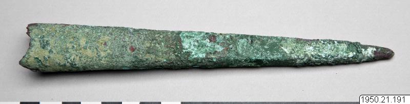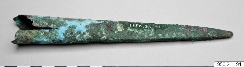 • Spets av brons. Att skaftas. Vapen och/eller redskap. (Enligt generalkatalogen). Konisk spets, fyrkantig mot spetsen, med holk.