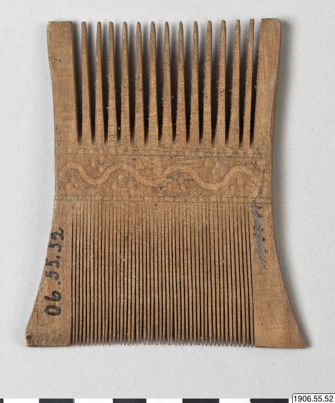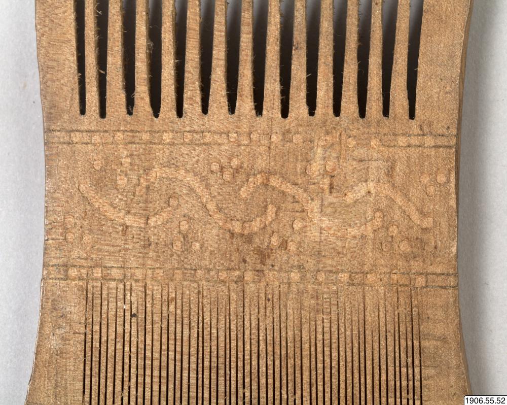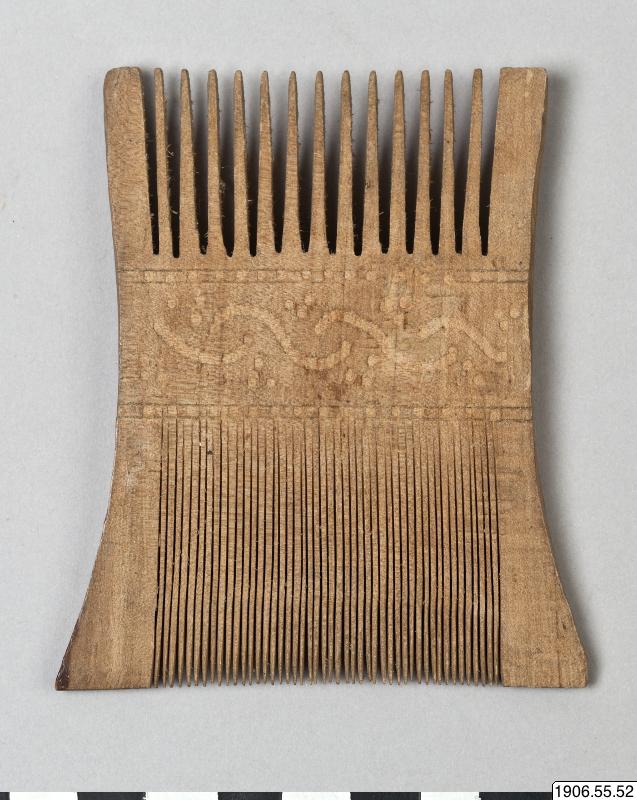 Kam av trä, dubbelkam. En kamrad åt varje håll, med utsirad dekoratiom mellan dem, i form av en våglinje och prickar.