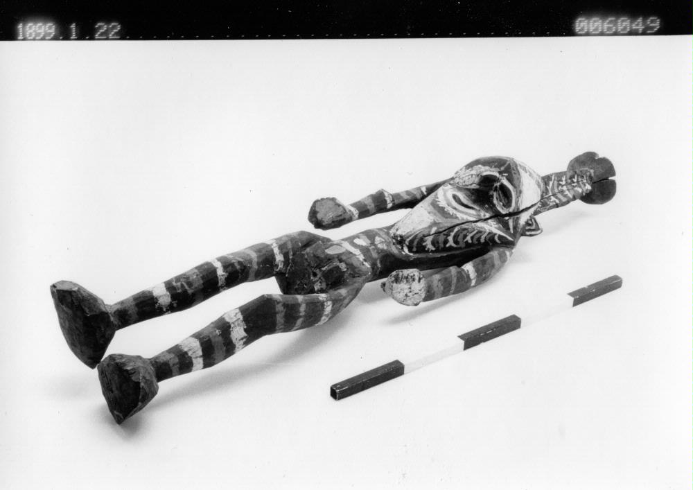 Manlig figur med spetsig näsa (sepik?) samt en hög "håruppsättning". Den är grundad med svart (sot) med påmålade ränder och andra dekorationer i rött (jord), vitt (kalksten) och gult (växt/jordfärg?). Typisk nedre Sepik man.(Enligt Regius, Hélena). Ena armen samt genitalierna avslagna.