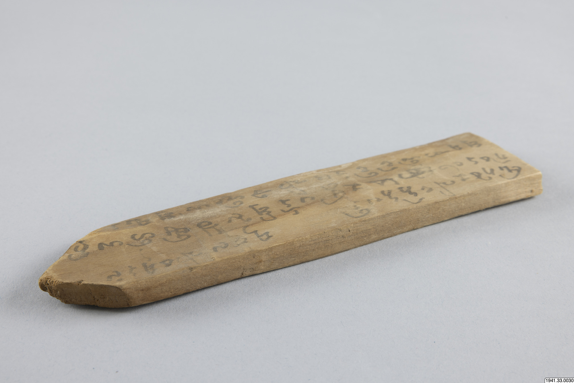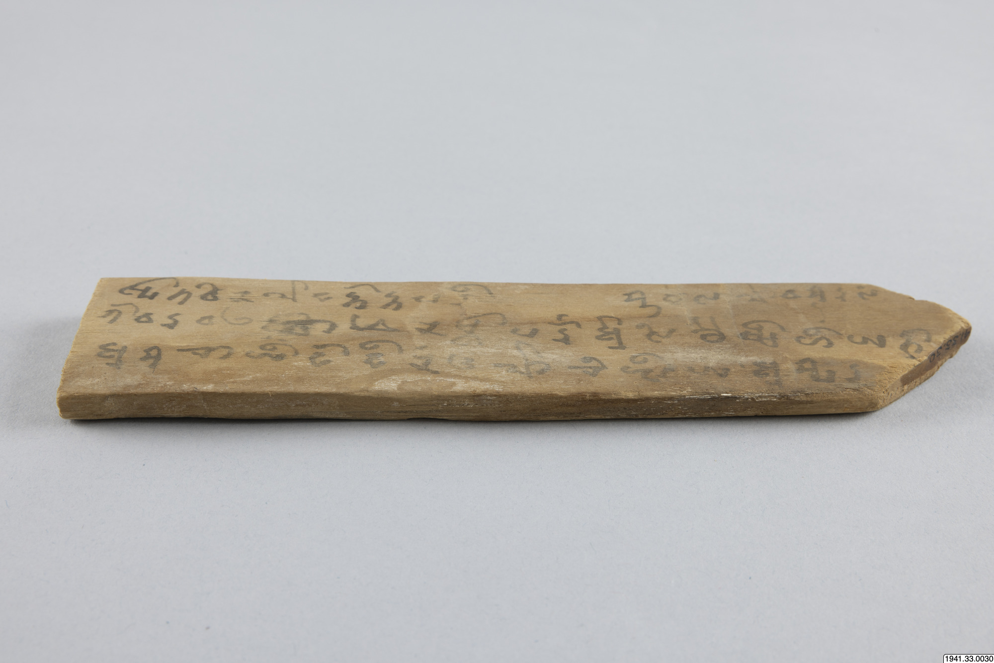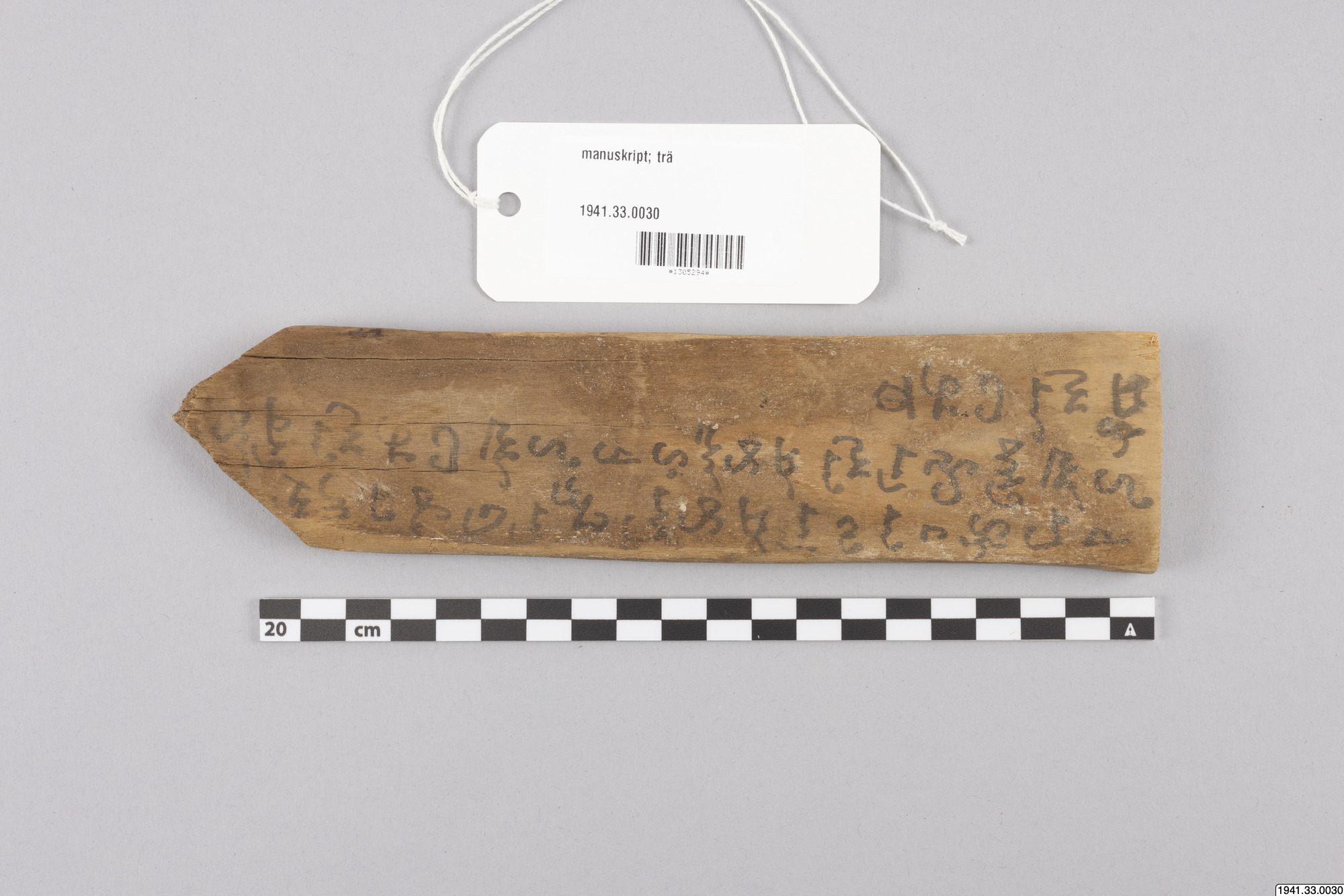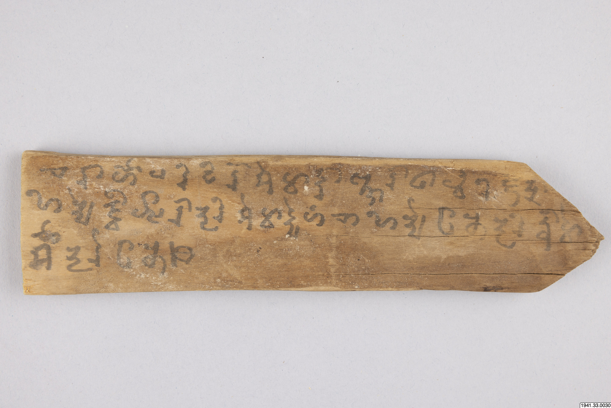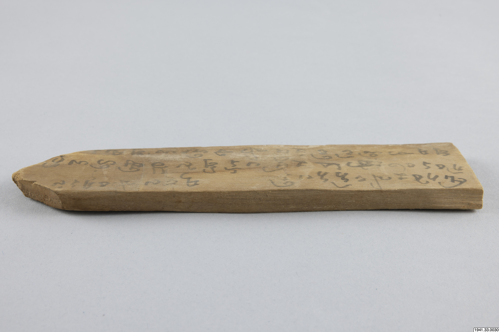 Handskrift på trästav. Texten är på språket Saka eller Sakiska (även khotanesiska eller khotansakiska) ett utdött östiranskt språk. Folkgruppen Saker, eller Skyter, var nomadiska och räknas som utdöda sedan 900-talet. Området skriften kommer från är idag Xinjiang, Kina. Skriften är en variant av typen brahmi (brahmiskrift) med viss modifikation, bl.a. tillagda tecken.