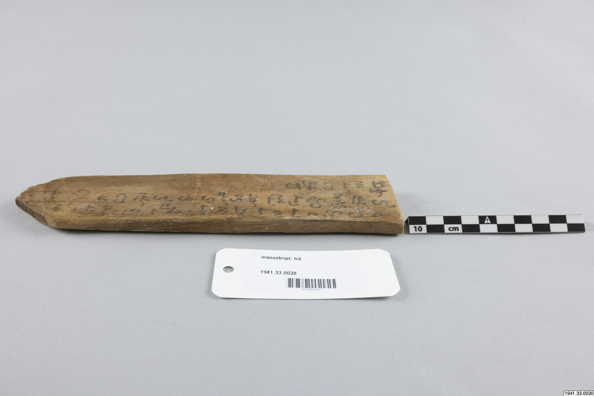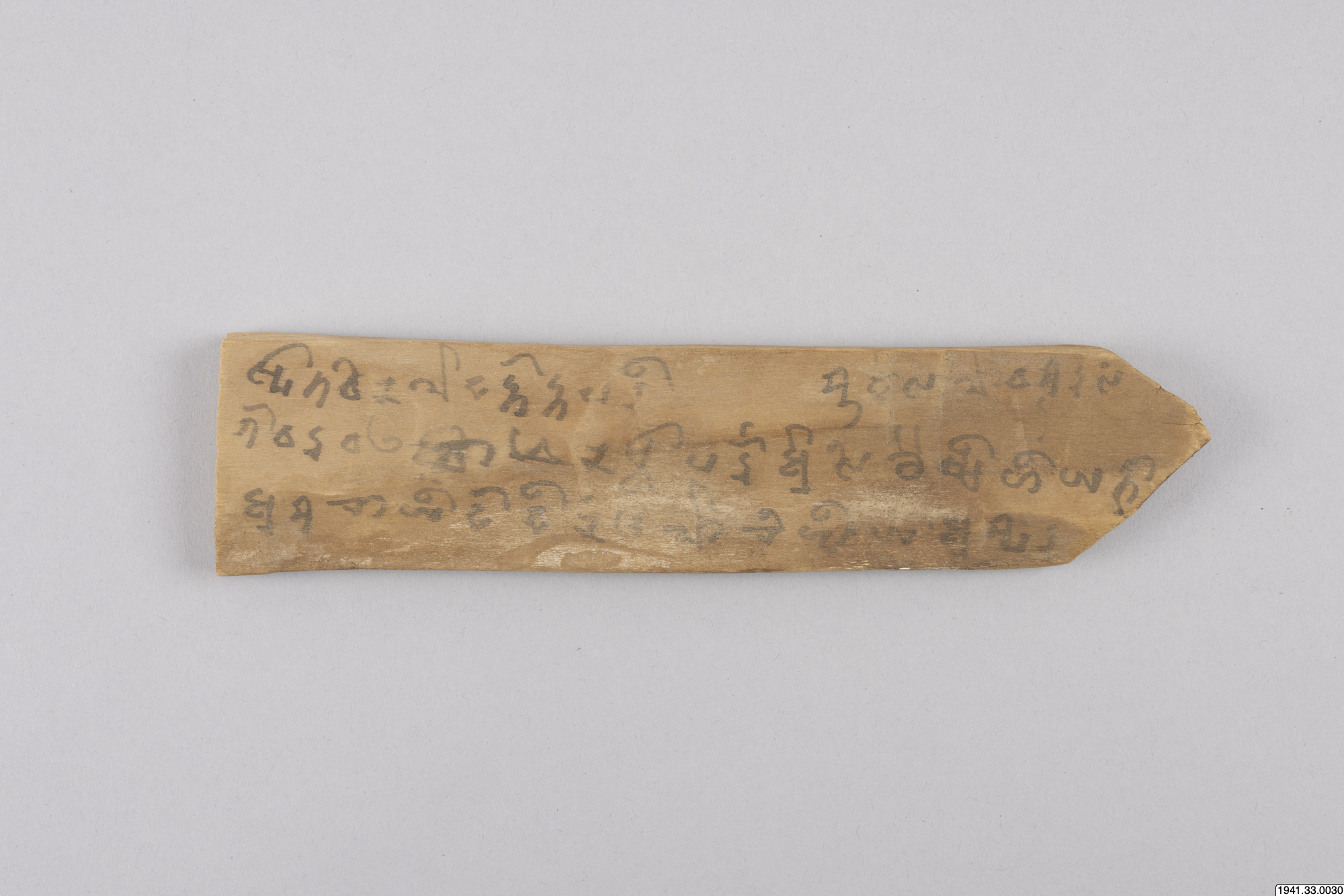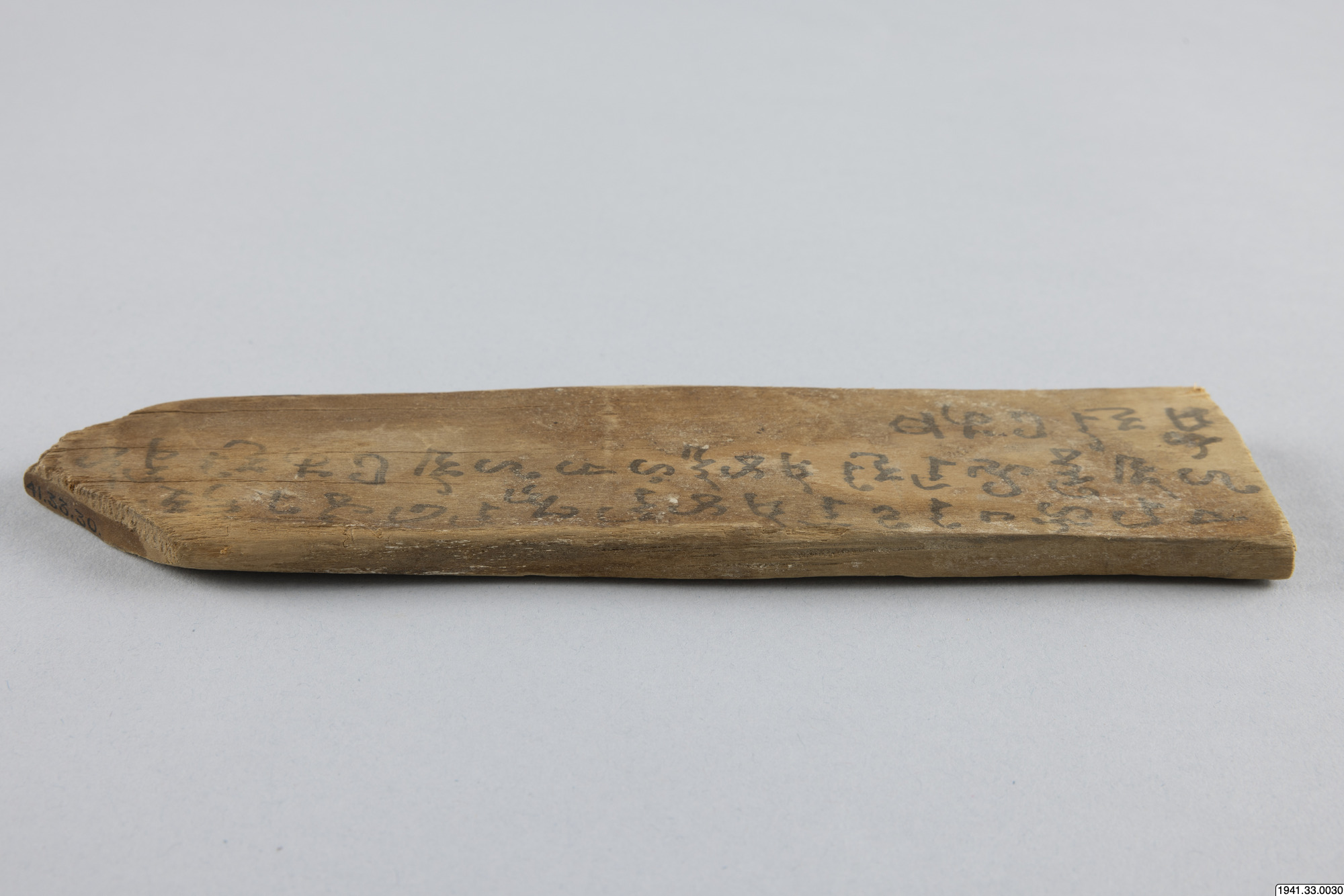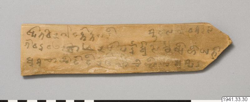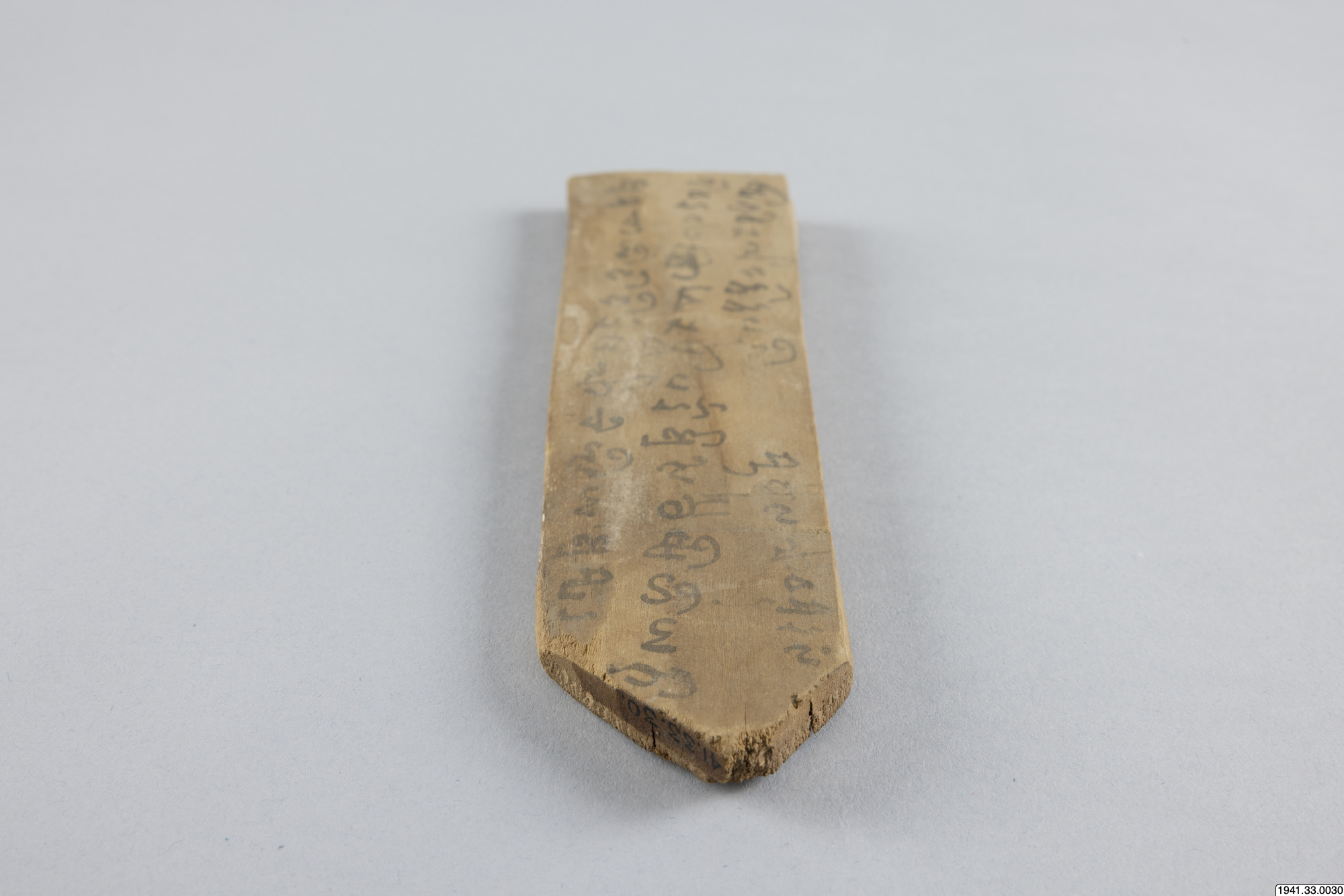 Handskrift på trästav. Texten är på språket Saka eller Sakiska (även khotanesiska eller khotansakiska) ett utdött östiranskt språk. Folkgruppen Saker, eller Skyter, var nomadiska och räknas som utdöda sedan 900-talet. Området skriften kommer från är idag Xinjiang, Kina. Skriften är en variant av typen brahmi (brahmiskrift) med viss modifikation, bl.a. tillagda tecken.