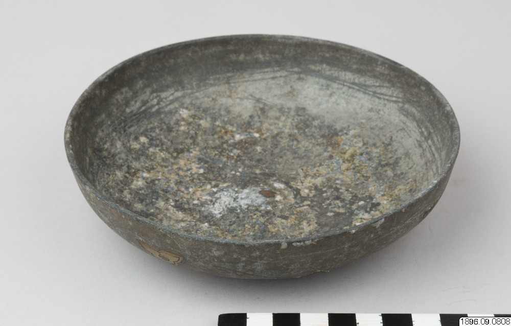 • Tennskål med dekorativa mässingsinläggningar. Dekorationerna föreställer en abstrakt girlang. Spår av någon form av innehåll på insidan av skålen.