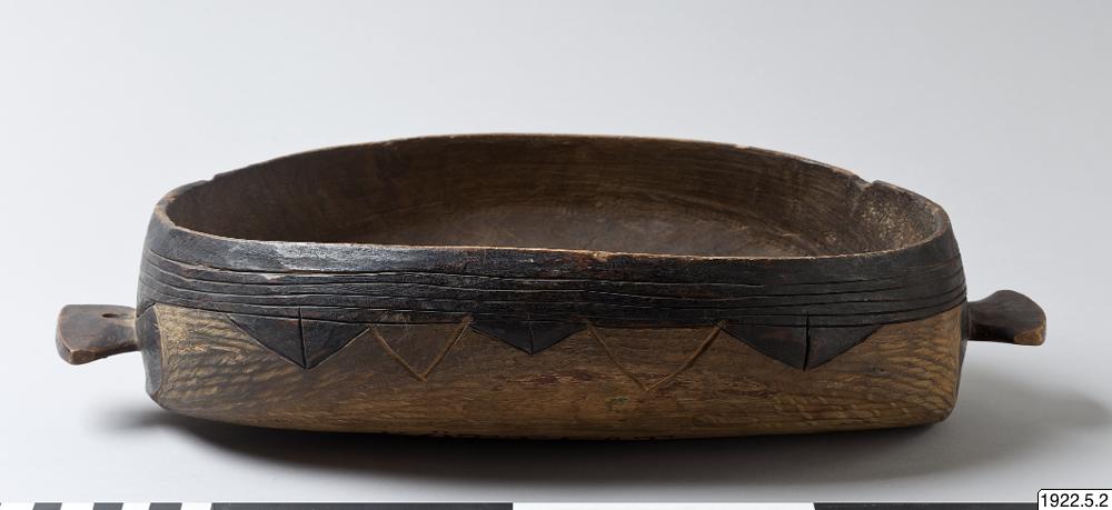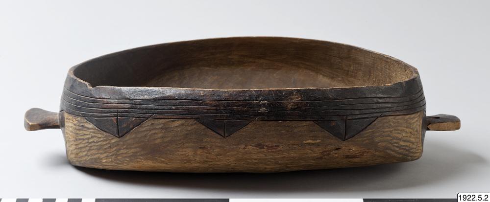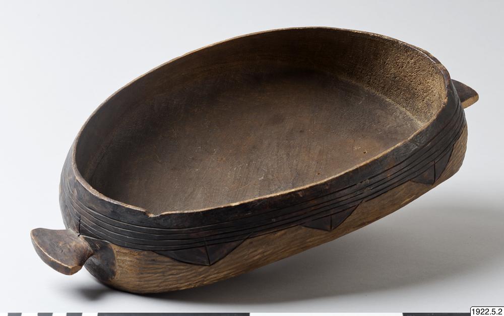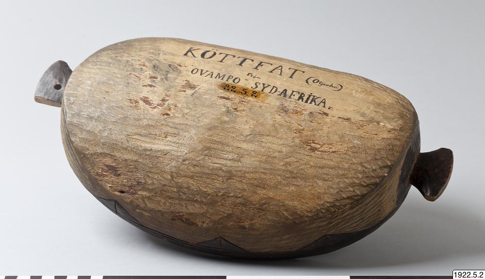 Fat , köttfat. Lågt, brett avlångt—ovalt med plattad botten och ett kort handtag vid var sida, det ena genomborrat. Runt övre kanten fem inskurna linjer och nedanför dem inskärningar i form av låga, likbenta trianglar med spetsarna riktade nedåt. Märkt i botten: "Köttfat (Otjiahá) från Ovampo, Syd-Afrika".