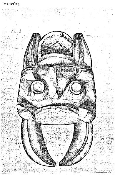 Mask av trä, Ansiktet utfört med kraftiga reliefpartier, pannan som en framskjutande horisontalflåns, kinderna som koner med plan spetsyta etc. Upptill två hornliknande utskott som bildar en nästan sluten cirkel. Kavitet på baksidan. Höjd 40 cm, Bredd max.23 cm, Tjocklek max. 18 cm. Yacouba-folket bosatta kring Man och Danand, nära gränsen till Libpria. [ocr]