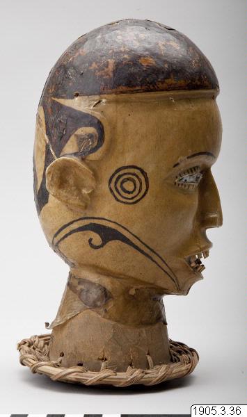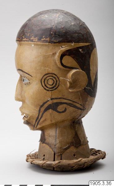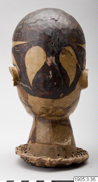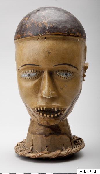 • Gudabild, huvud av trä överdraget med ap(?)-hud. Svarta målningar. Nedtill en flätad ring. Jmf. inv. 1900.19 och 1940.30. Se Cl Kjersmeier: Centres de style de la sculpture negre aficaine, s. 11, 31. fig. 50-53. Köpenhamn 1936. Calabar, Nigeria, Ekoi-folket