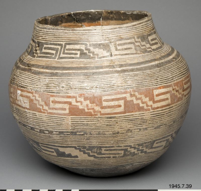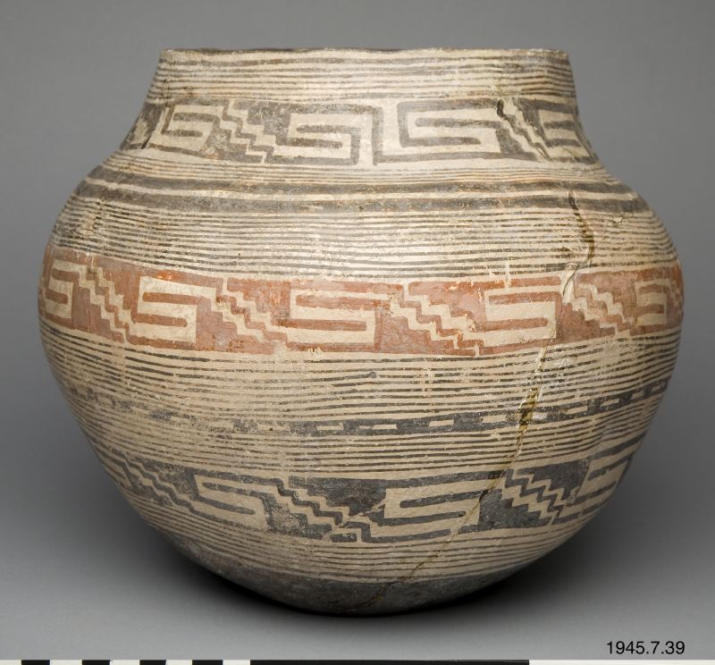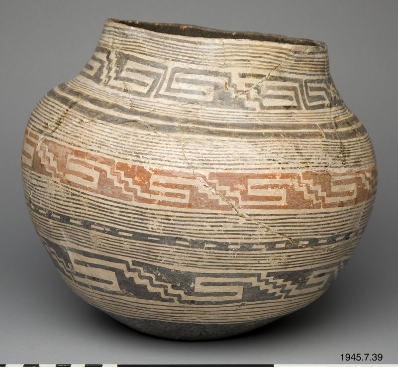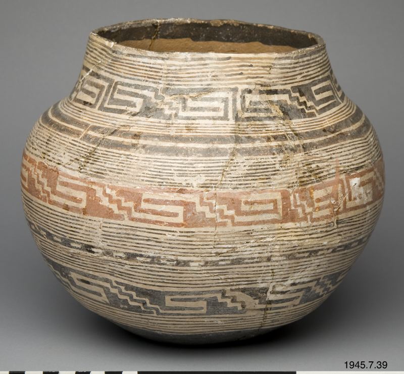• Lerkärl, stor kruka med rundad kropp, vid mynning, något koniskt mynningsparti samt intryckt botten, dvs om krukan vändes upp och ned blir botten skålformig. Rik dekor i svart och rött på gul botten bestående av bårder av parallella linjer, meander och trappstegsliknande mönster mm. Den synnerligen vackra krukan är lagad med den är fullständig. (generalkatalogen)