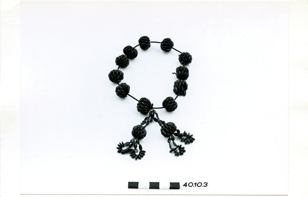 av platta bruna frön (samma material som nr. 1 och 2.)Fröna äro förenade till stora runda kulor, som äro upphängda på ett snöre. På mitten två hängen. [ocr]
