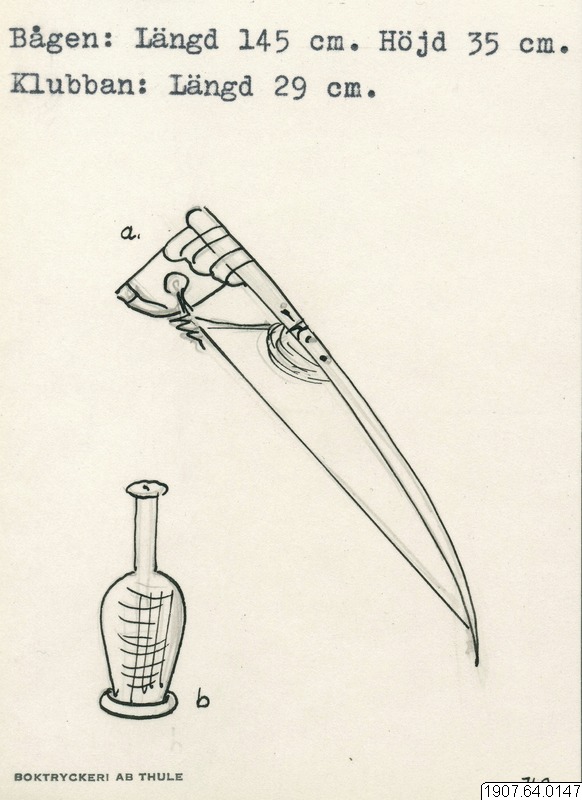 Båge med klubba (A-B) (djai och tokmek) för rensning av ull och bomull. Konia. Utst.kat. nr 156. A) Något böjd trästav med en kvarts-cirkelformig träplatta med hål i centrum i ena ändan. Mellan denna och träspetsen en sträng. På trästaven ett garnhandtag. B) Klubban av trä. Koniskt huvud slutande i spetsen med en platta, i den motsatta planare änden ett rakt handtag, som slutar med ett huvud. Bågen: Längd 145 cm. Höjd 35 cm. Klubban: Längd 29 cm. [ocr]