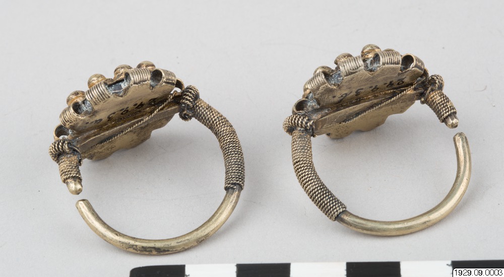 Tåring av mässing. Stor, rund klack med 10-naggad kant. Själva ringen en ten med motställda, icke sammansvetsade ändar. Delvis omvirad med fin mässingstråd. b Tåring av mässing som 3 a Diam. (i ytterkant) 3,5 cm. Tenens tjockt. 2,5 mm. Klackens diam. ung. 2,7 cm. Främre Indien Nr 4 Sumatra.