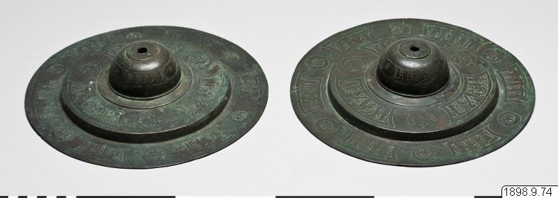 • Ett par cymbaler. Ovansidan dekorerad med skrivtecken och ornament. Hål i mitten av cymbalen.