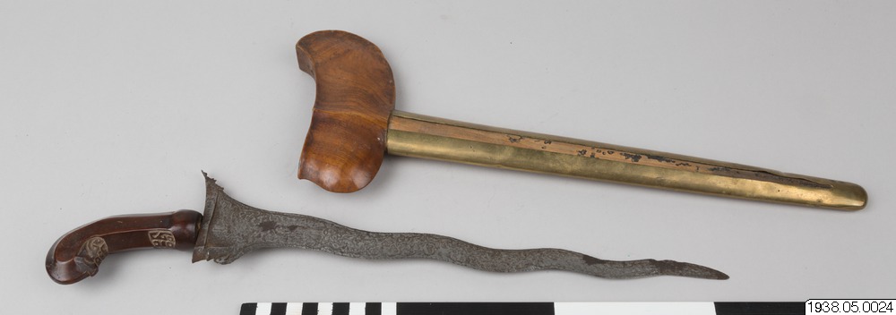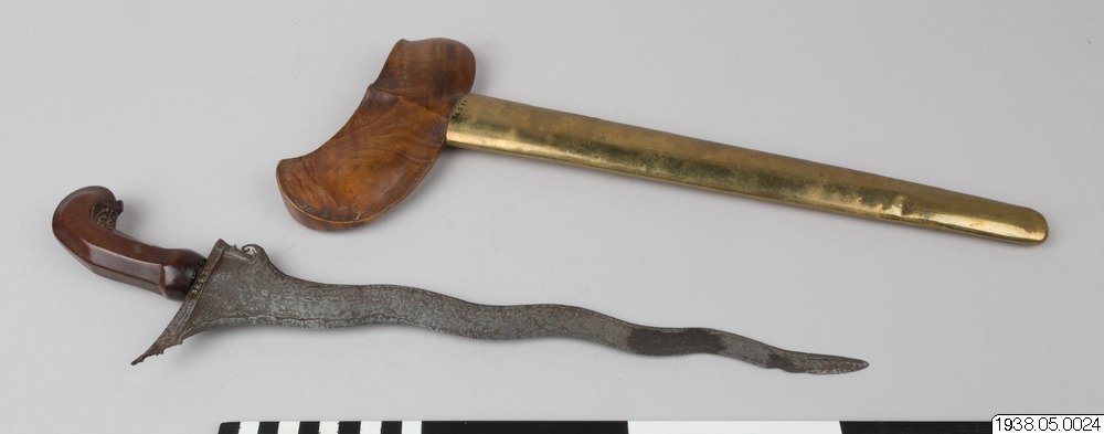 Klingar av den vågformiga typen med vackert mönstrad yta. Fästet av mörkbrunt trä,/dffmma typ som föreg. nr. Slidan av trä, överdragen med'gul metallplåt sing) längsgående öppning kör:ednu föl^konimen prydnad. Warongkås av brunt flamMigt'ttä. Krisenå längd 45 cm. Slidans längd 42 cm. Java [ocr]