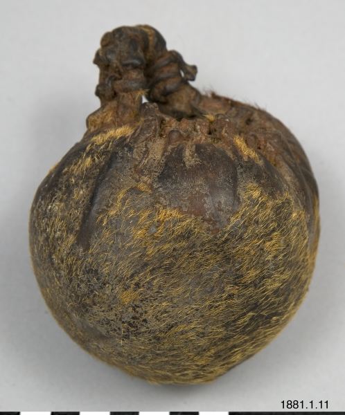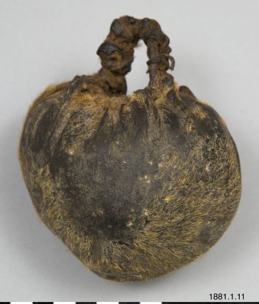 • Mindre klotformigt kärl, delvis ludet skinn; avsett för förvaring av fett. Rester av rödfärgning vid mynningen.