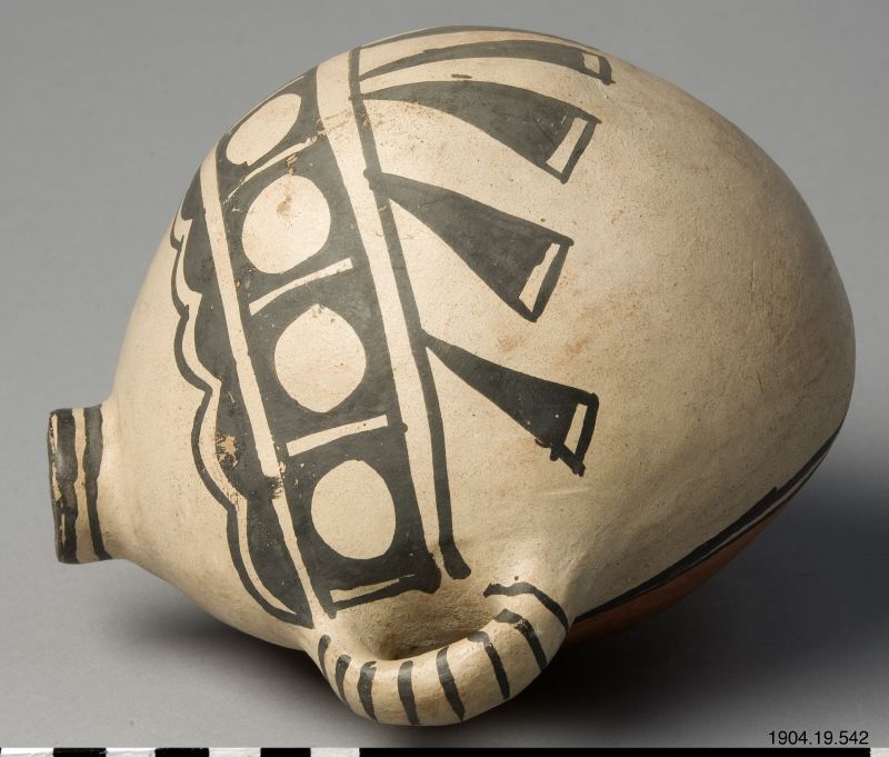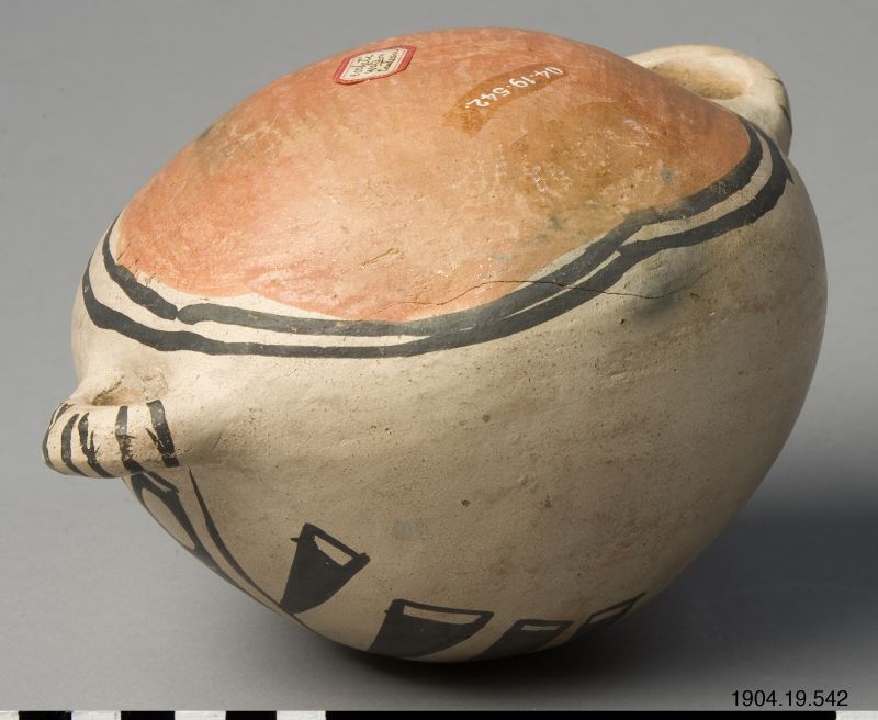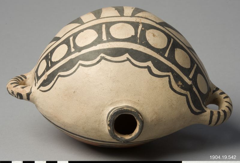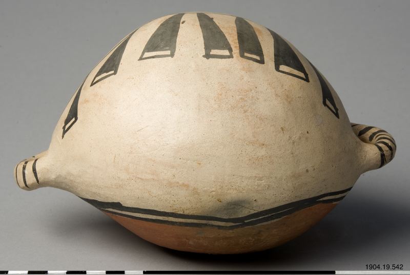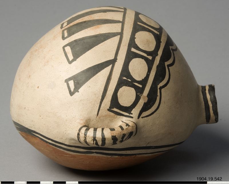 Lerkärl med hög kullrig översida, undersidan något mindre kullrig. Ett mindre öra på var sida samt en smal halsöppning. Dekor på översidan i svart och beige, undersidan odekorerad röd lera. "Water canteen".