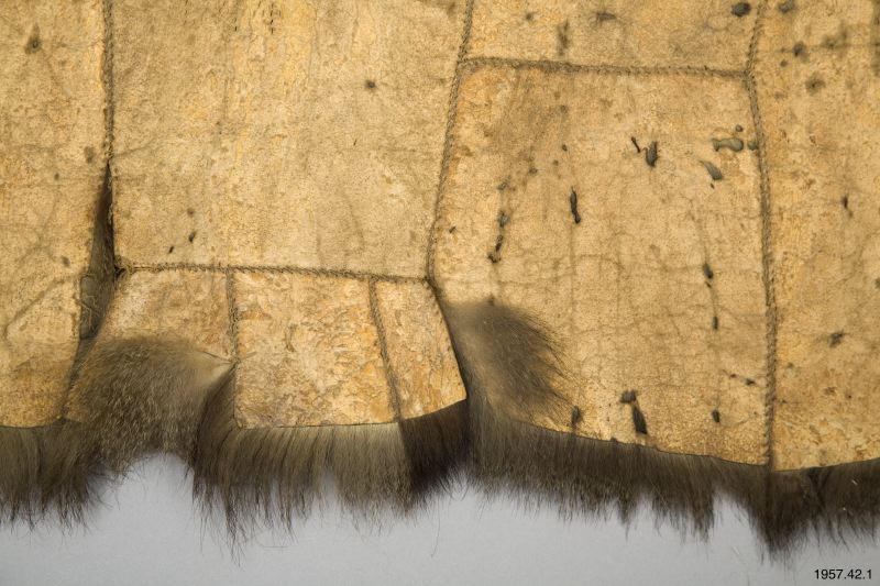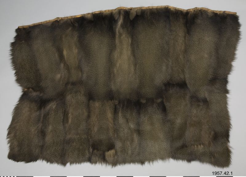 Skinn/päls/mantel av hopsydda rektangulära pälsbitar. Upptill en linning samt ett läderband. Manteln bäres med en läderrem över ena axeln. Den har tillhört elgonihövdingen Arap Sangula som bodde på Elgon på ca 3000 m höjd, straxt nedanför trädgränsen. Hemförd från 1 Svenska Mount-Elgonexpeditionen 1920 (Jfr Inv 1921.01.)