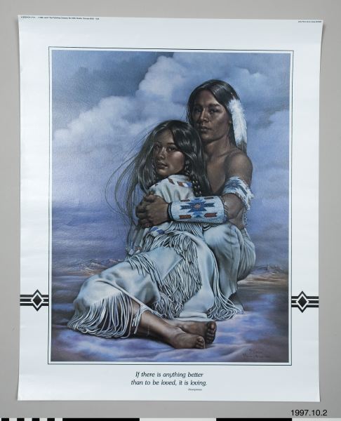 • Affisch föreställandes ett ungt indianpar, man och kvinna, i en omfamning. Mannen bär vita byxor samt armprydnader med pärlbroderier och en örnfjäder i håret. Kvinnan bär en vit klänning med fransar och pärlbroderier. I bakgrunden berg och moln.