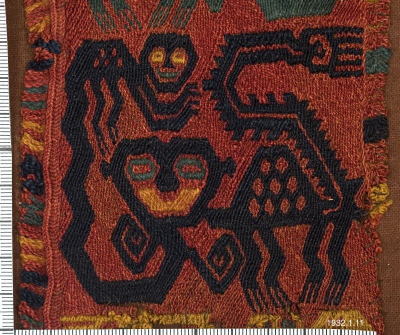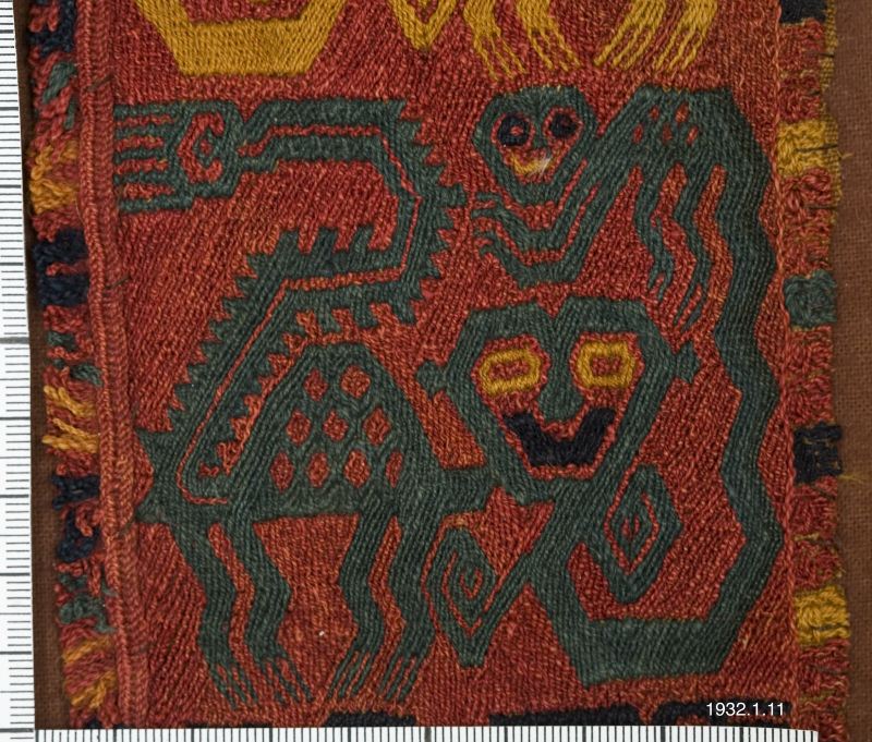 Troligen dekorativ detalj av en större vävnad. Bottenfärgen röd. Dekorationen utgöres av 9 över varandra ställda mytiska, kattliknande djur, varannat med huvudet åt höger varannat åt vänster. De äro utförda i svart, gult, grönt, och är således det överOta svärt, det andra gult, det tredje grönt, det fjärde svart o.s.v. Från kattens, [ocr]