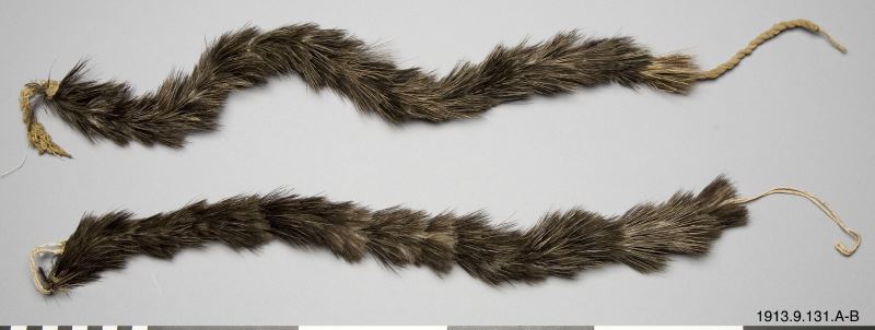 • Fotband för man, två stycken. Caraguata-snören med intvinnade fjäder-remsor av mörk, gråaktig färg.