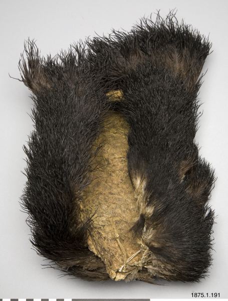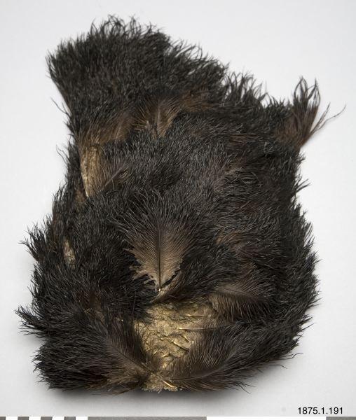 • Huvudbonad av strutsskinn, med kvarsittande svarta fjädrar. Avlång form.